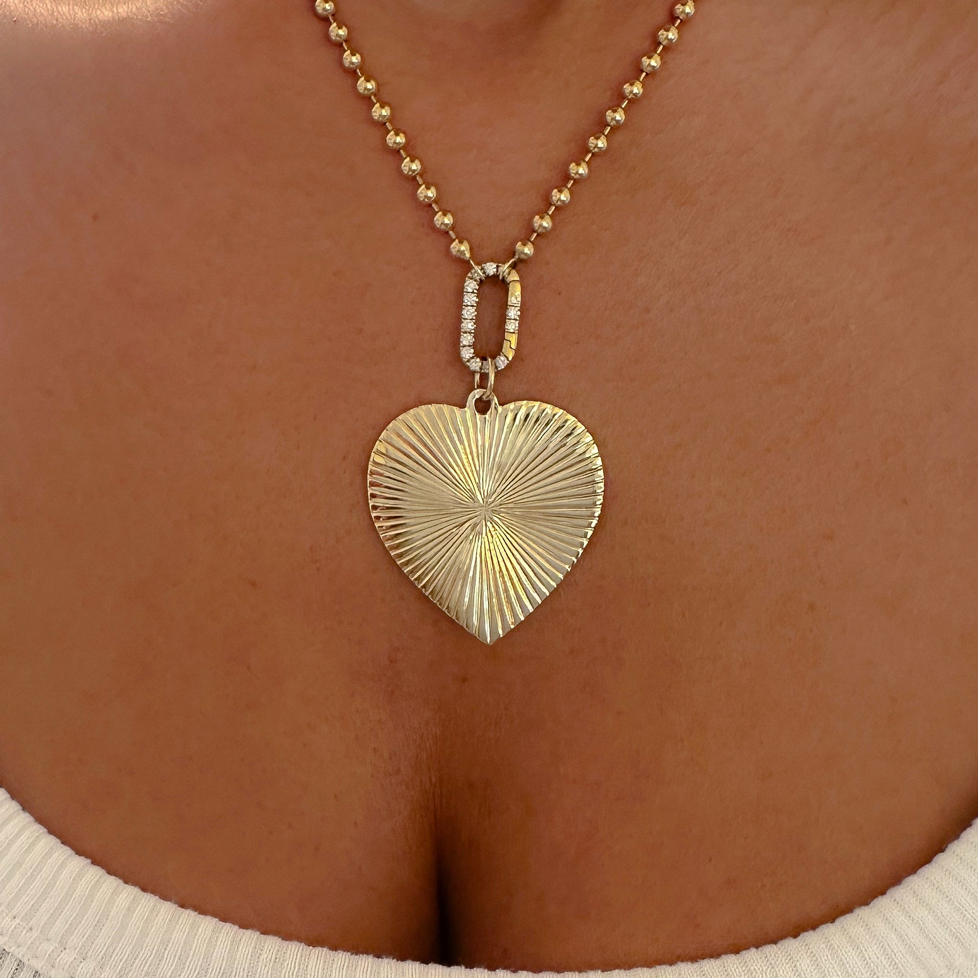 This uniquely handcrafted charm pendant enhancer is composed entirely of 14K solid gold and finished with genuine GVs1 quality natural real diamonds covering both sides of the link's surface.