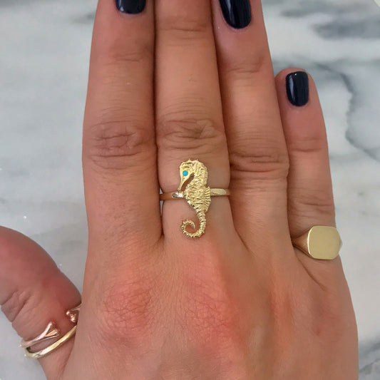 14K Gold Large Size Seahorse Ring with Turquoise Eye