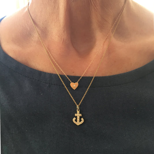 14K Gold Pavé Diamond Anchor Necklace, XS Size