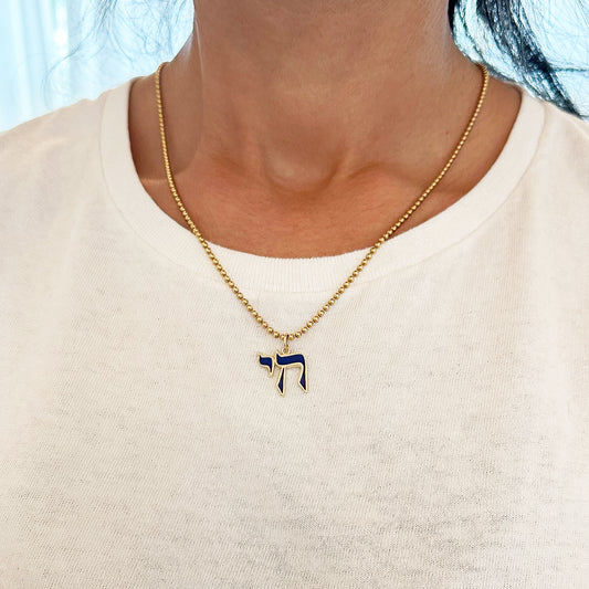 14K Gold Royal Blue Enamel Hebrew Chai Charm Pendant