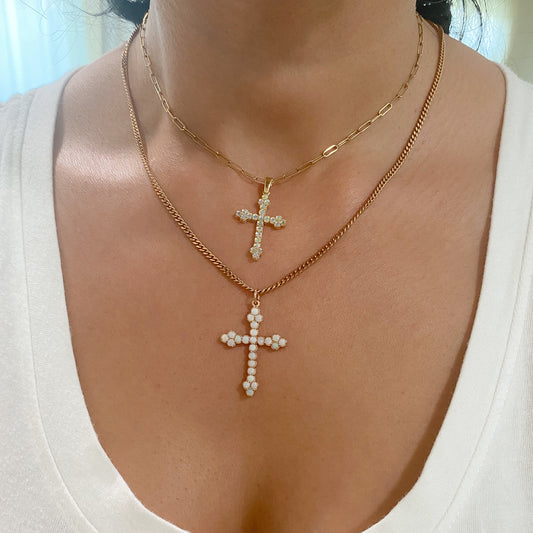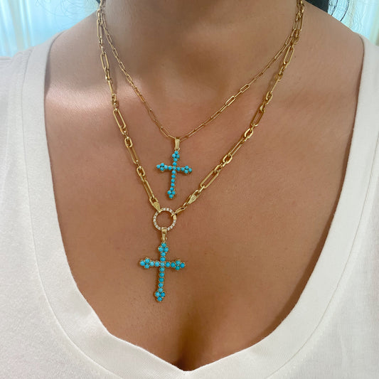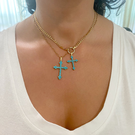 14K Gold Pavé Turquoise Cross Necklace, Small Size