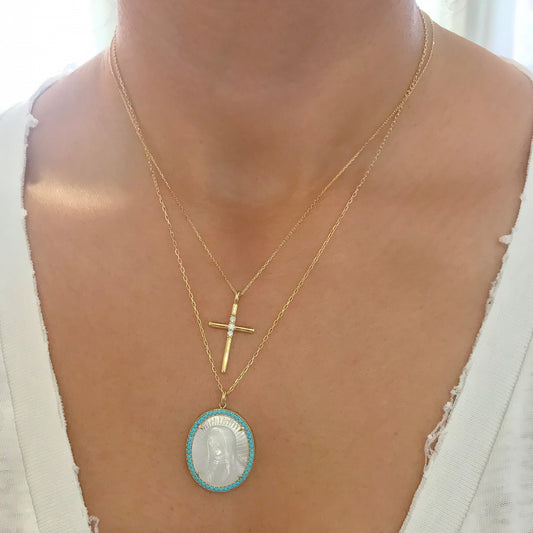 14K Gold Virgin Mary Miraculous Medal Mother of Pearl & Pavé Turquoise Necklace, LIMITED EDITION