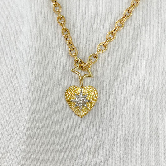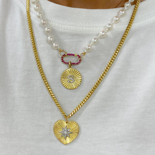 14K Gold Pavé Diamond Starburst Fluted Heart Medallion Pendant, Large Size Heart