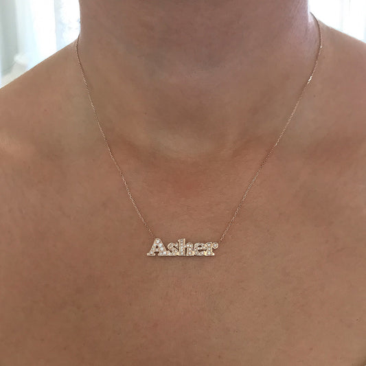 14K Gold Pavé Diamond Nameplate Pendant Necklace ~ Block Font