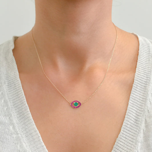 14K Gold Emerald Heart & Pink Sapphire Evil Eye Necklace