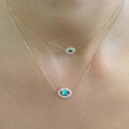 14K Gold Large Size Diamond & Turquoise Evil Eye Lashes Necklace