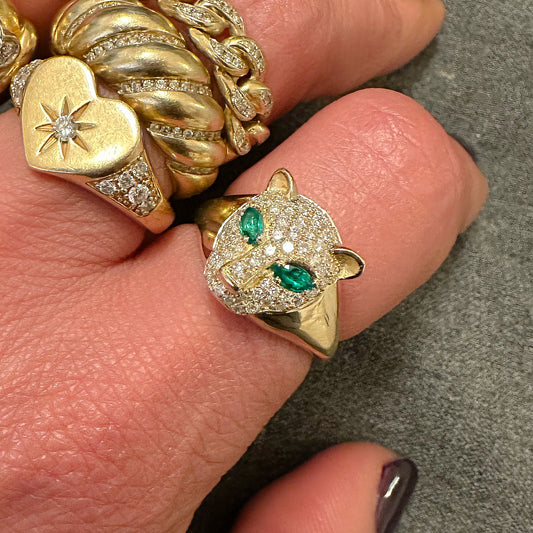 14K Gold Diamond Pavé Panther Signet Ring ~ Marquise Emerald Eyes