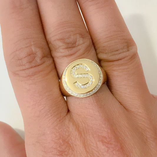 14K Gold Pavé Diamond Initial Large Round Signet Ring
