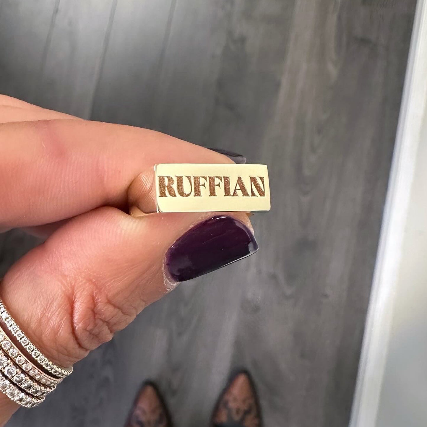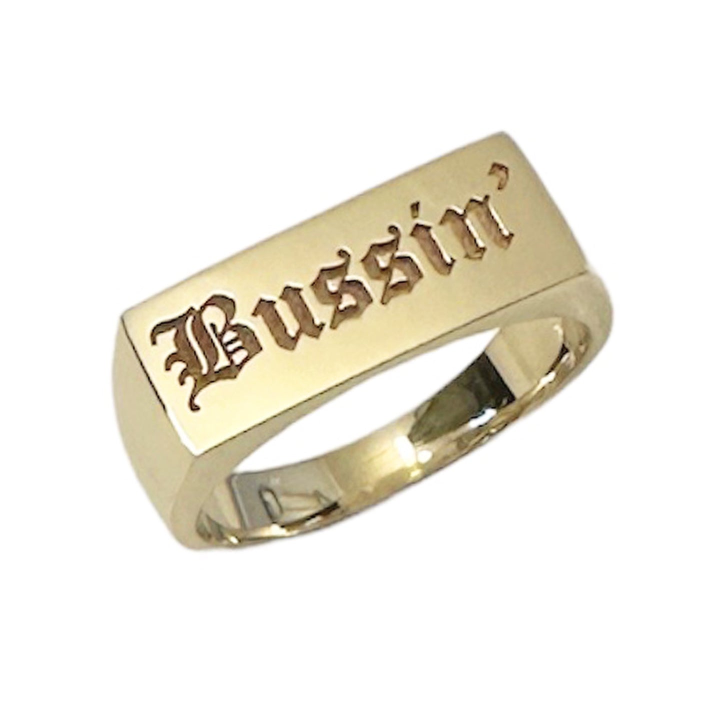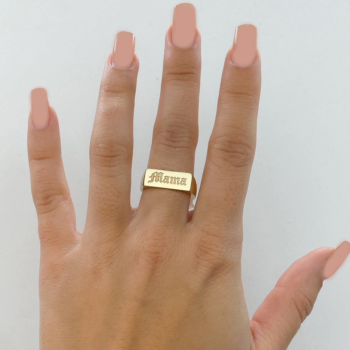 This rectangular shaped signet style ring is composed of 14K solid gold & can be finished with any font style engraving of any monogram initials, name, word or Roman numerals desired. Either way, with or without engraving this ring will be a great addition to your collection. This ring is entirely solid (NOT hollowed out on the inside) making is also possible for gemstone setting.