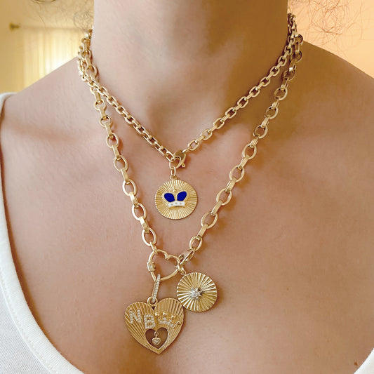 14K Gold Pavé Diamond Starburst Fluted Heart Medallion Pendant, XXL Size