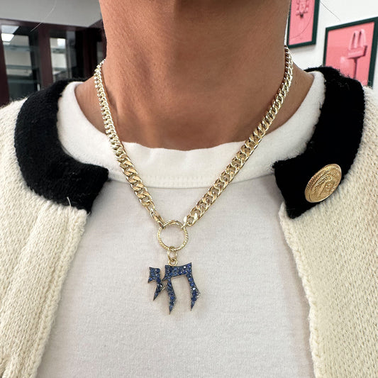 14K Gold Pavé Sapphire Hebrew Chai Charm Pendant