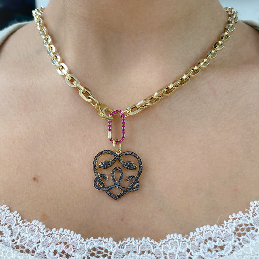14K Gold Pavé Black Diamond & Ruby Ouroboros Heart Pendant