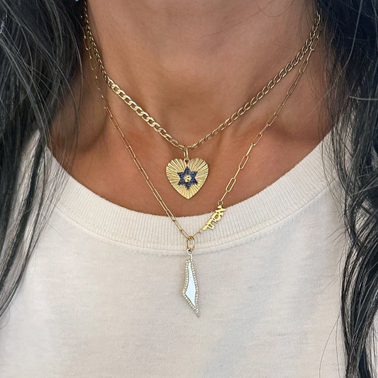 14K Gold Pavé Sapphire Star of David Fluted Heart Medallion Pendant, Medium Size Heart