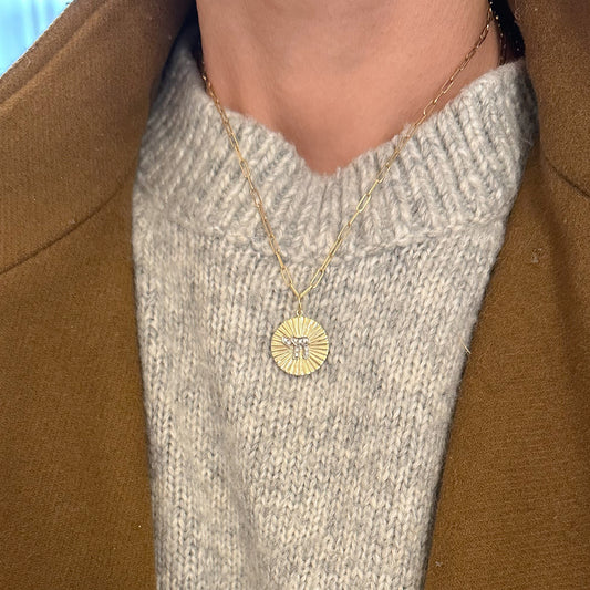 14K Gold Pavé Diamond Hebrew Chai Fluted Round Medallion Pendant