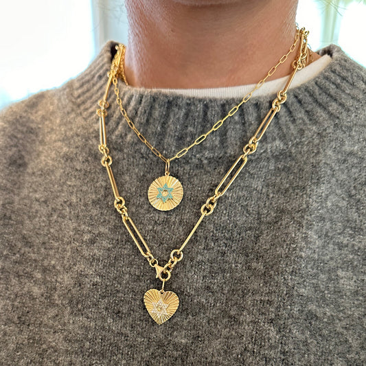 14K Gold Pavé Turquoise Star of David Fluted Round Medallion Pendant