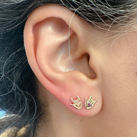 14K Gold Ruby "I Love You" Hand Sign Language Stud Earring
