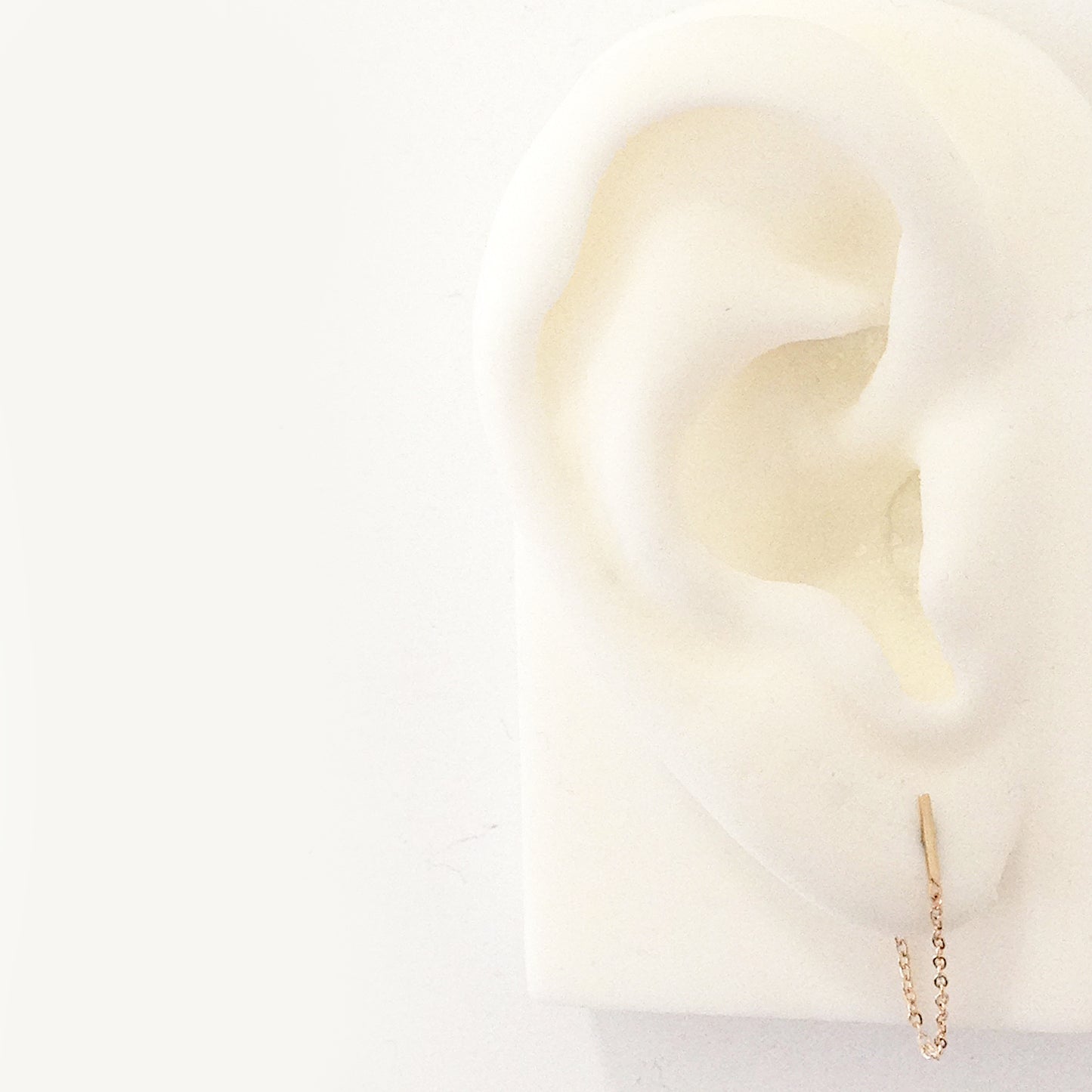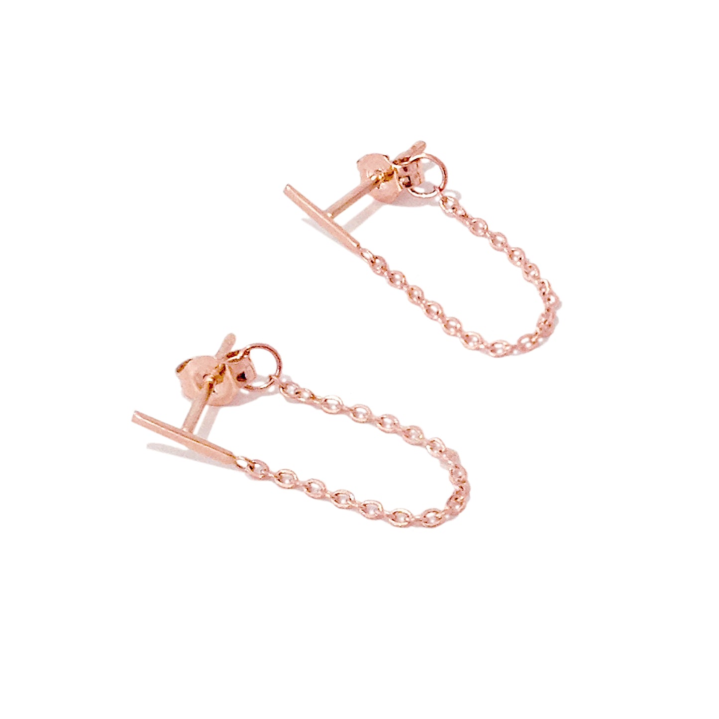 This precious pair of bar studs composed of 14K solid gold and connects to it's matching 14K solid gold secure earring back with a durable 14K solid gold chain.