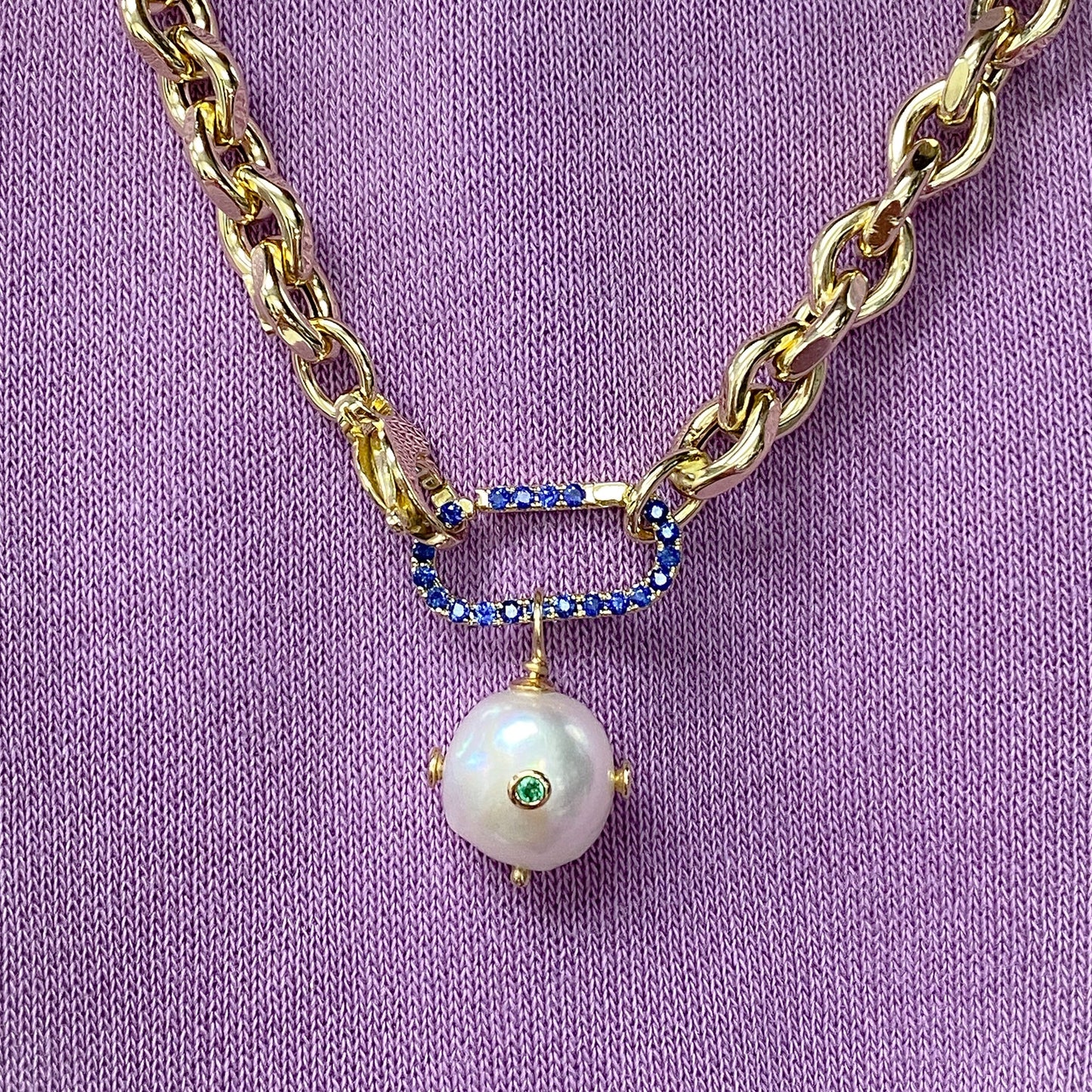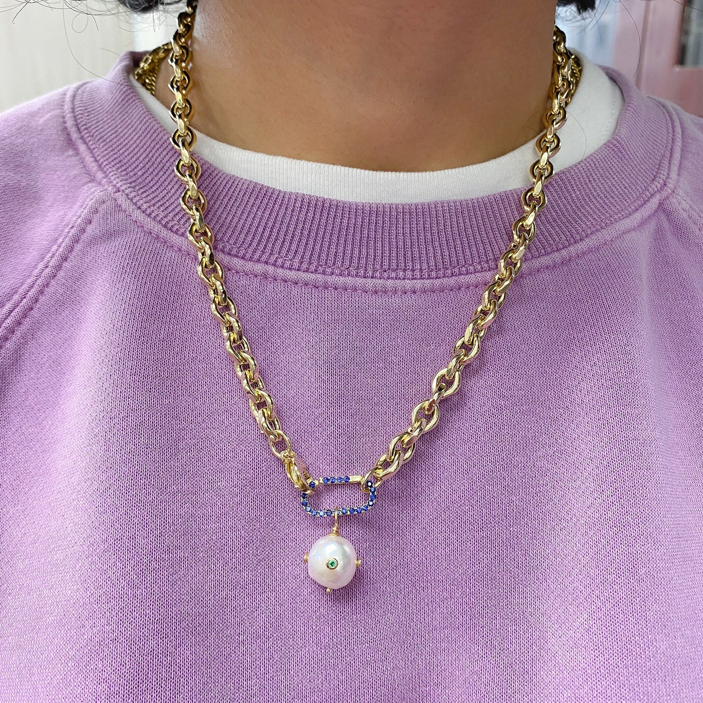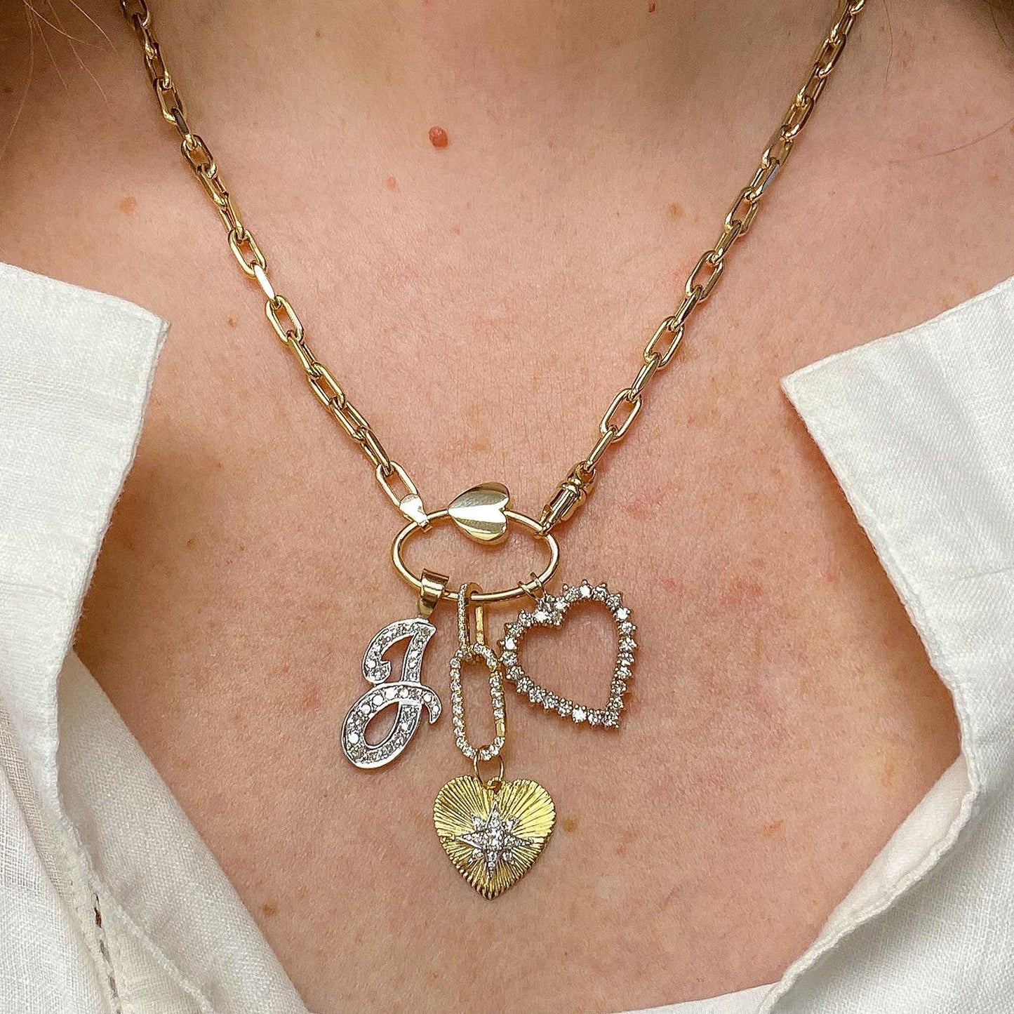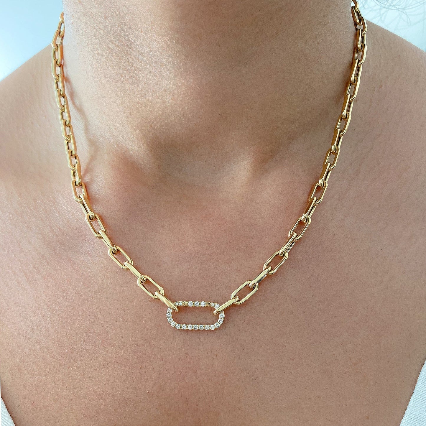 This distinctively handcrafted charm enhancer is crafted from 14K solid gold and features genuine AAA quality natural black diamonds adorning both sides of the elongated oval link.