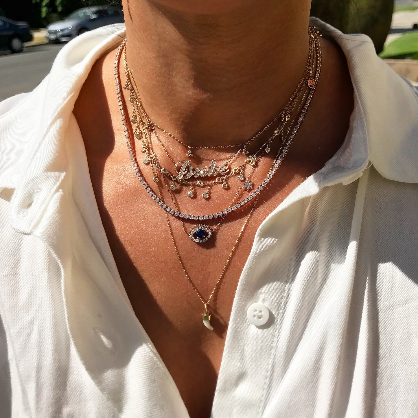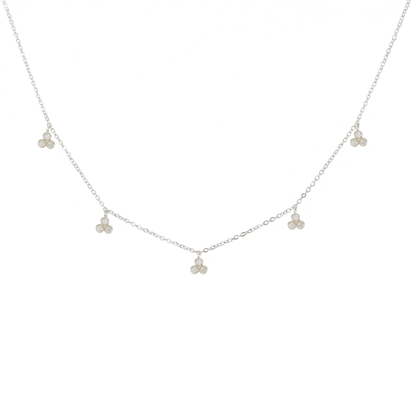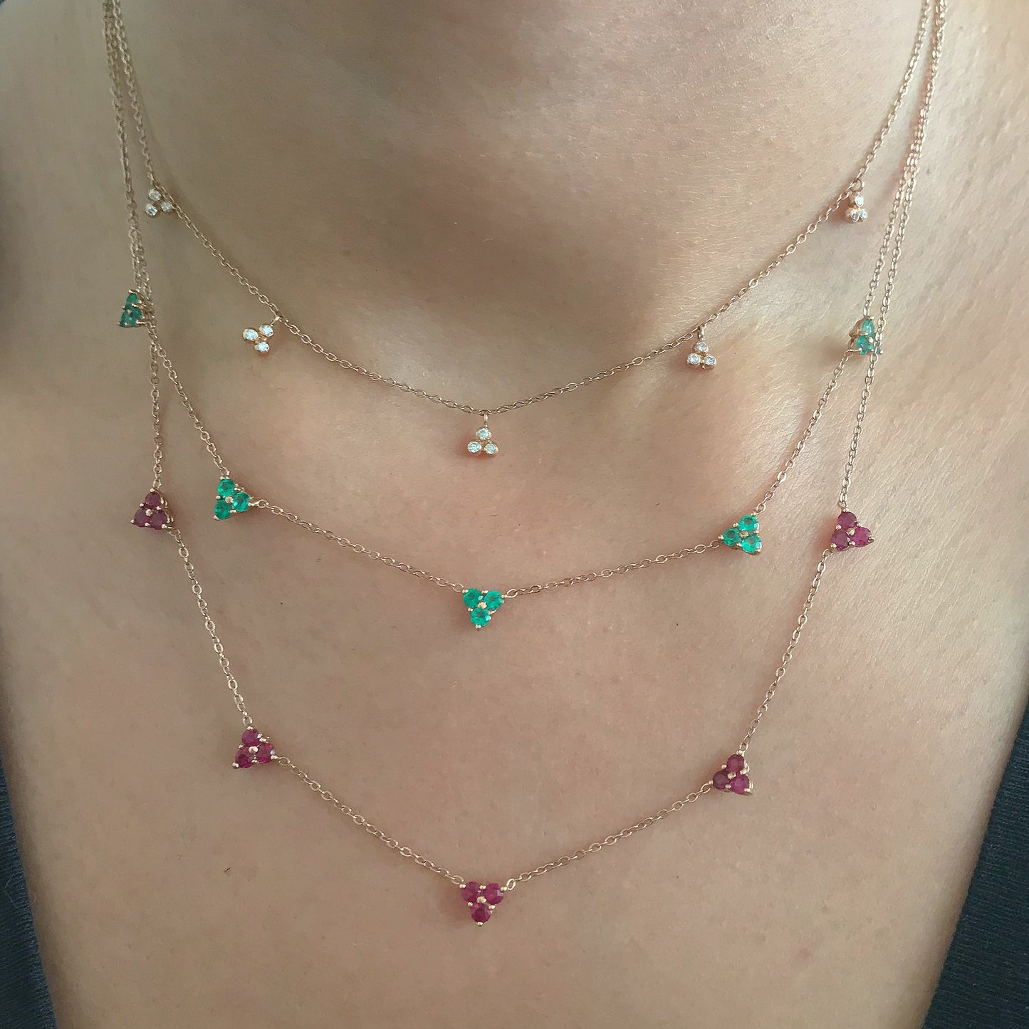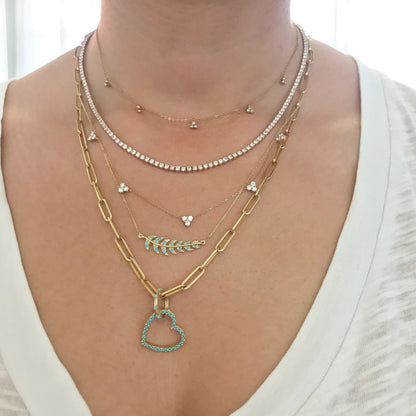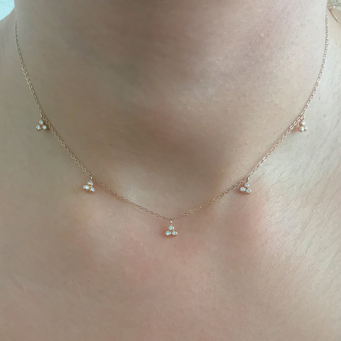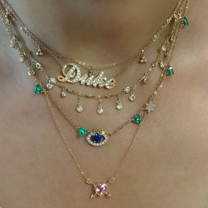This precious necklace is composed of 14K solid gold and beautifully complemented with GVs1 quality round brilliant cut real natural Diamonds. The charms are dangling off a delicate yet durable 14K solid gold chain, finished with a secure lobster claw clasp and Nana Bijou signature logo tag. This piece is adjustable in length.