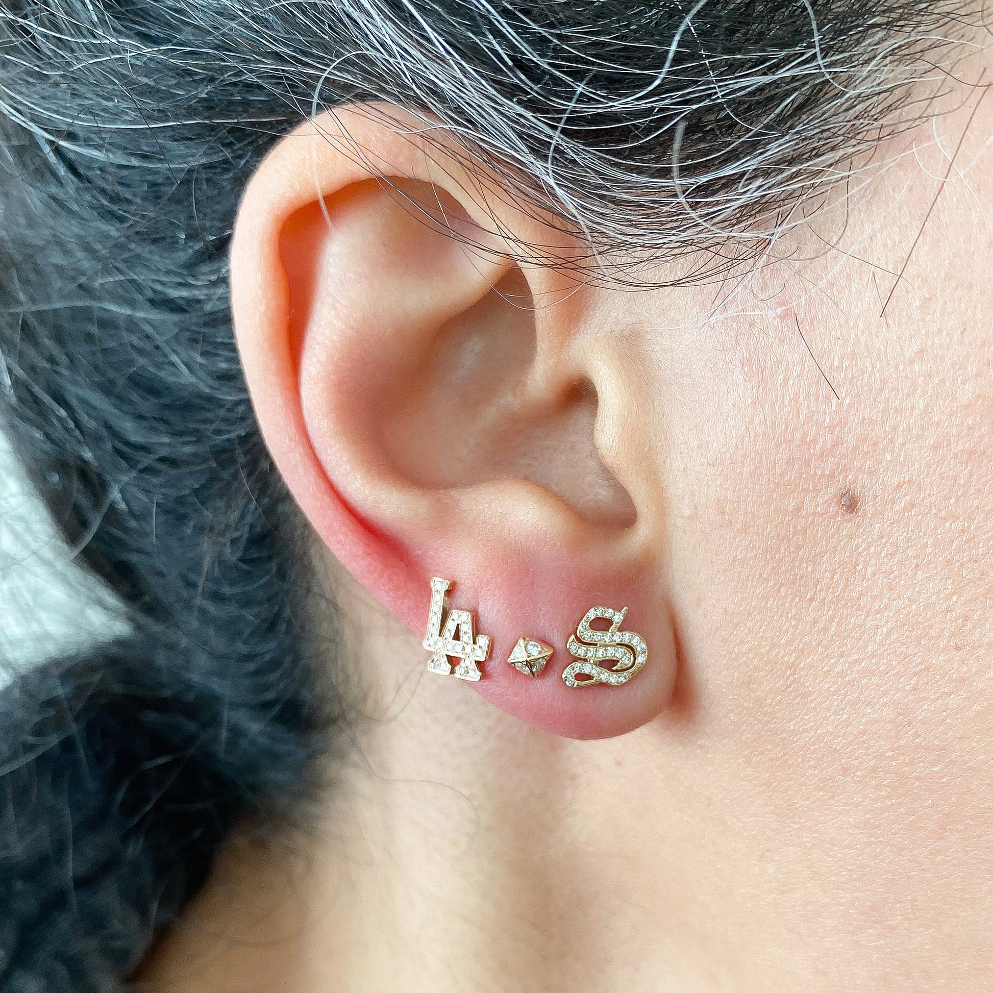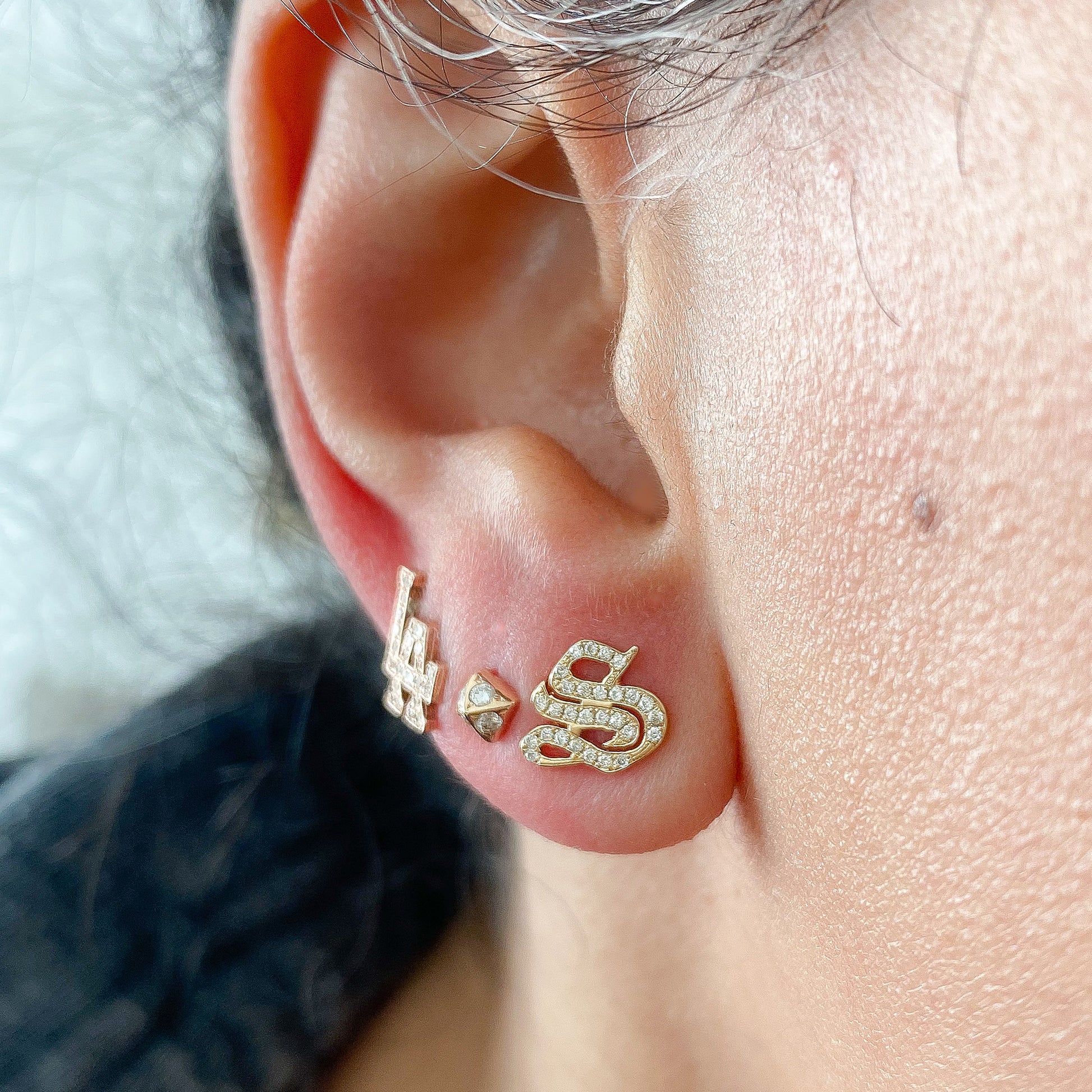 This finely handcrafted Old English font initial letter single earring stud is composed of 14K solid gold and finished with GVS1 quality natural real diamonds. Comes with matching 14K solid gold secure earring backs.