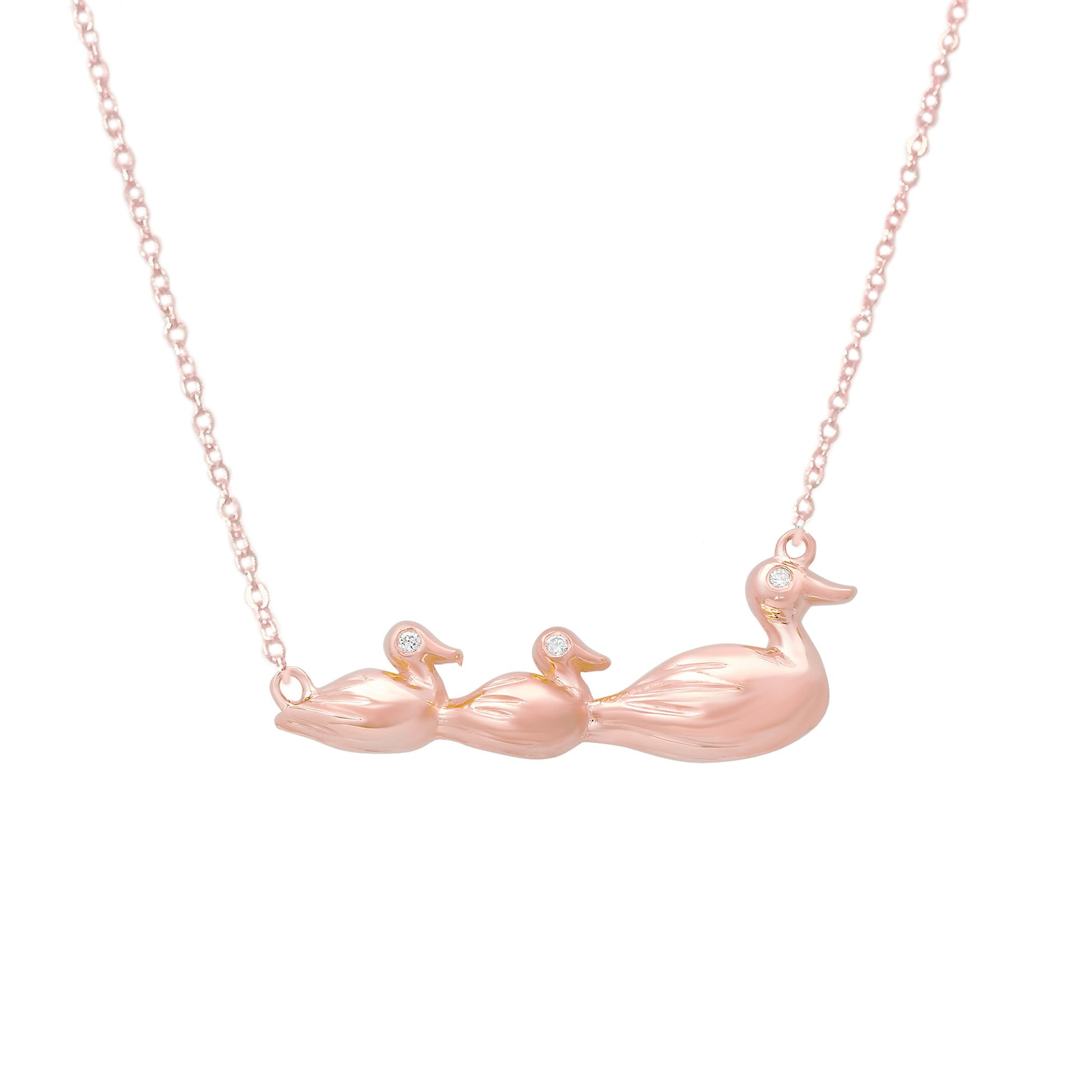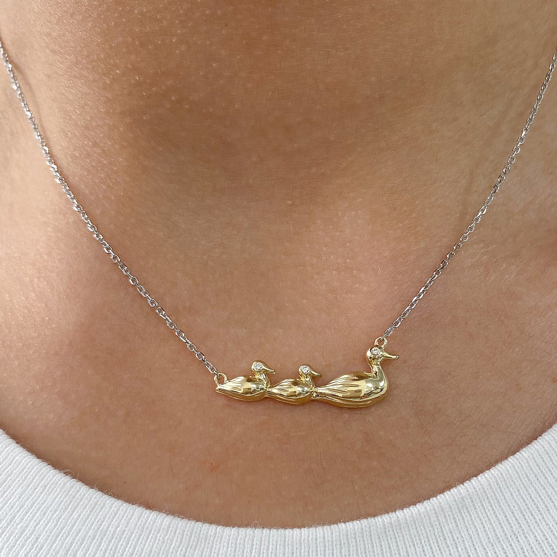 This distinctive Ducks in a Row pendant, crafted from solid 14K gold, represents maternal affection. It features genuine natural real GVS1 quality diamonds set in the ducks’ eyes and is complemented by a delicate, adjustable 14K gold chain designed for both elegance and durability.
