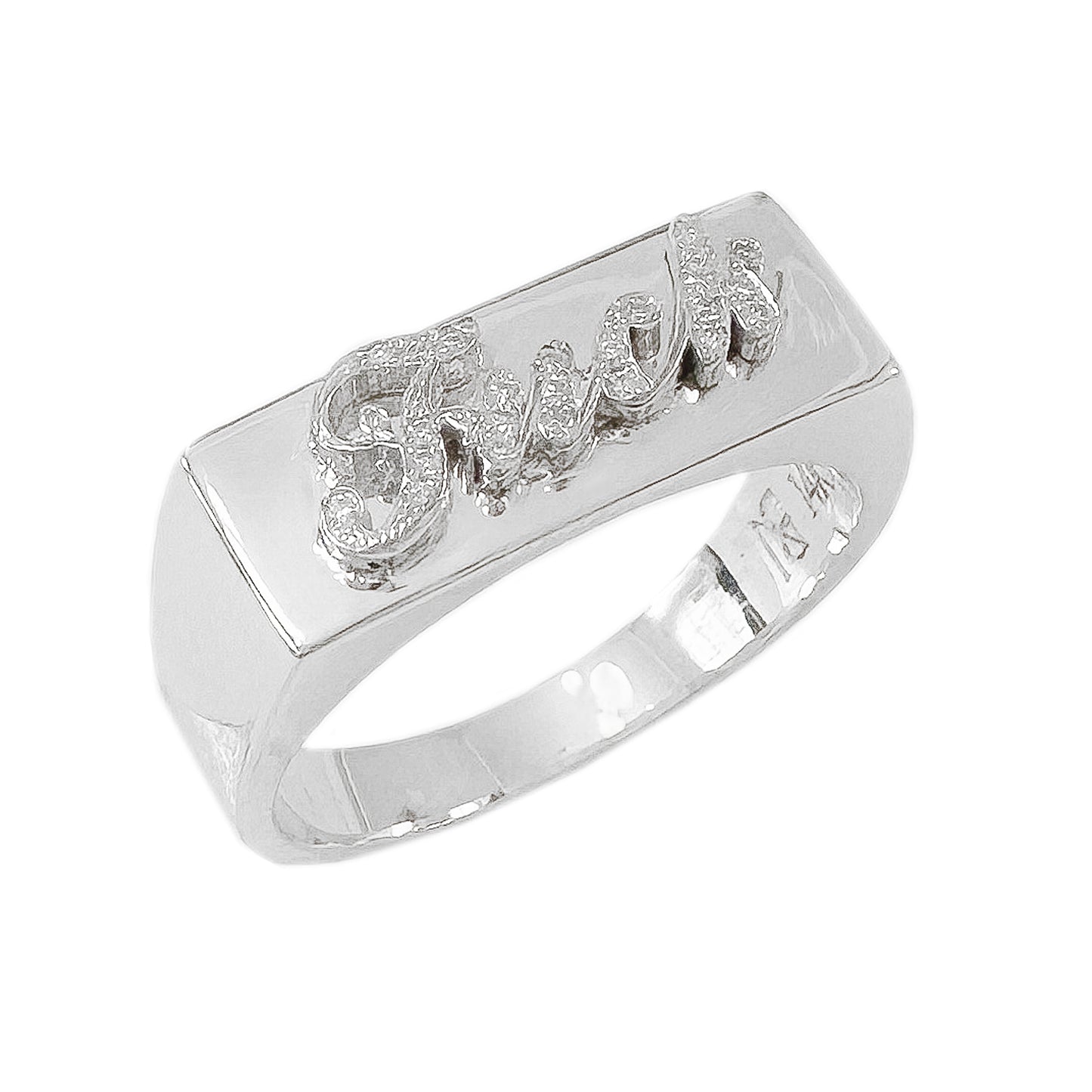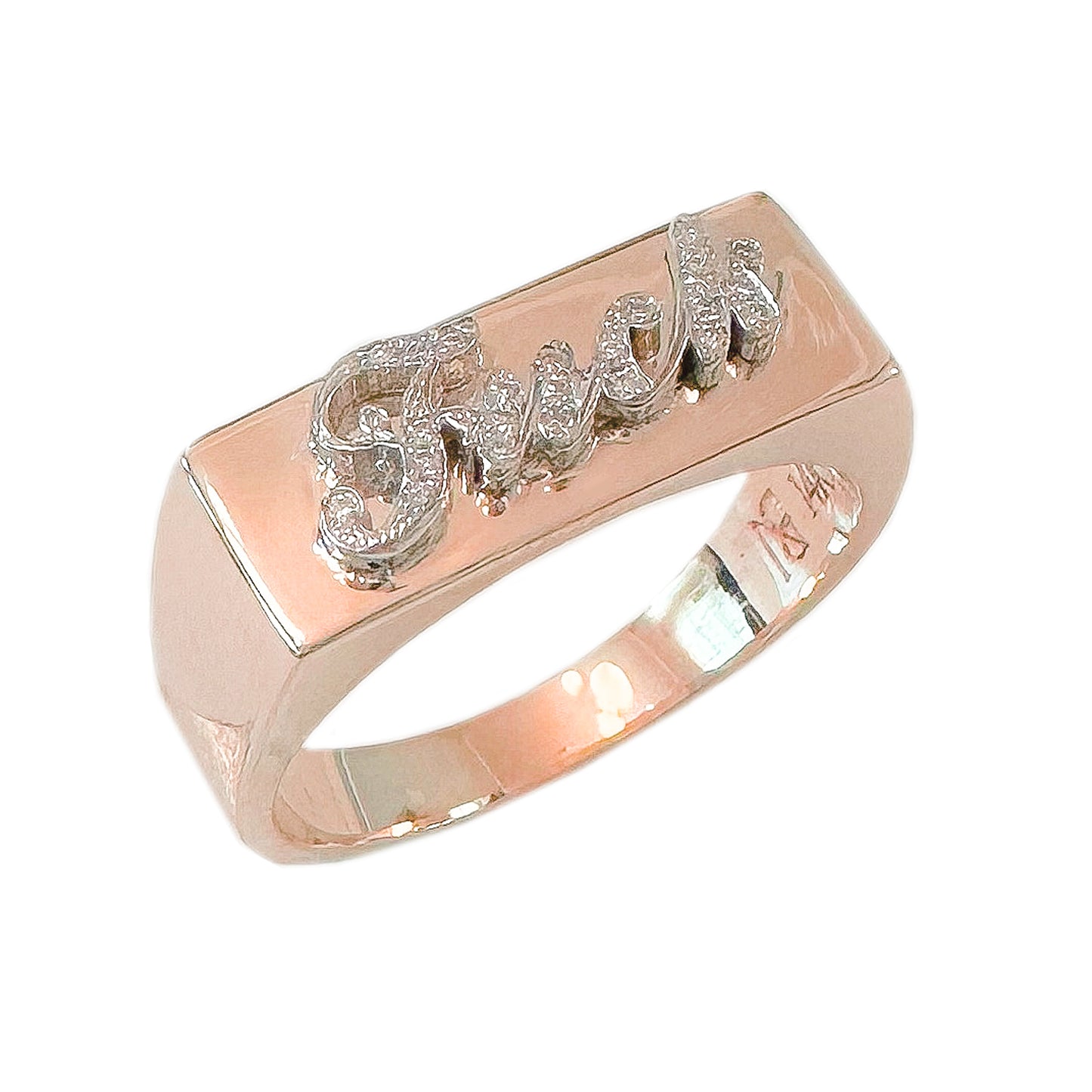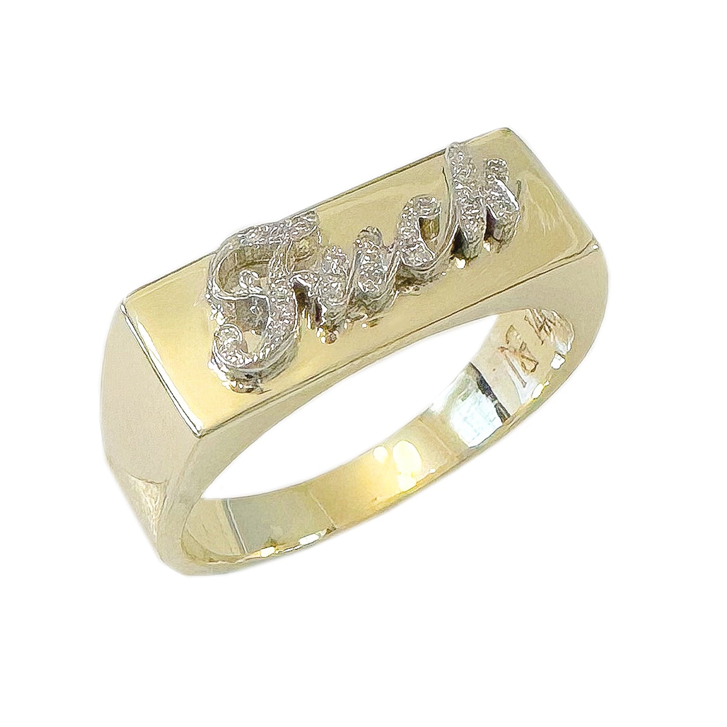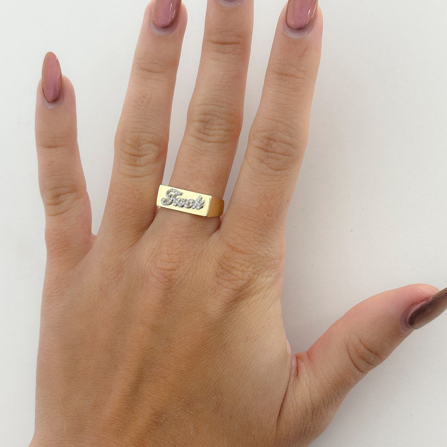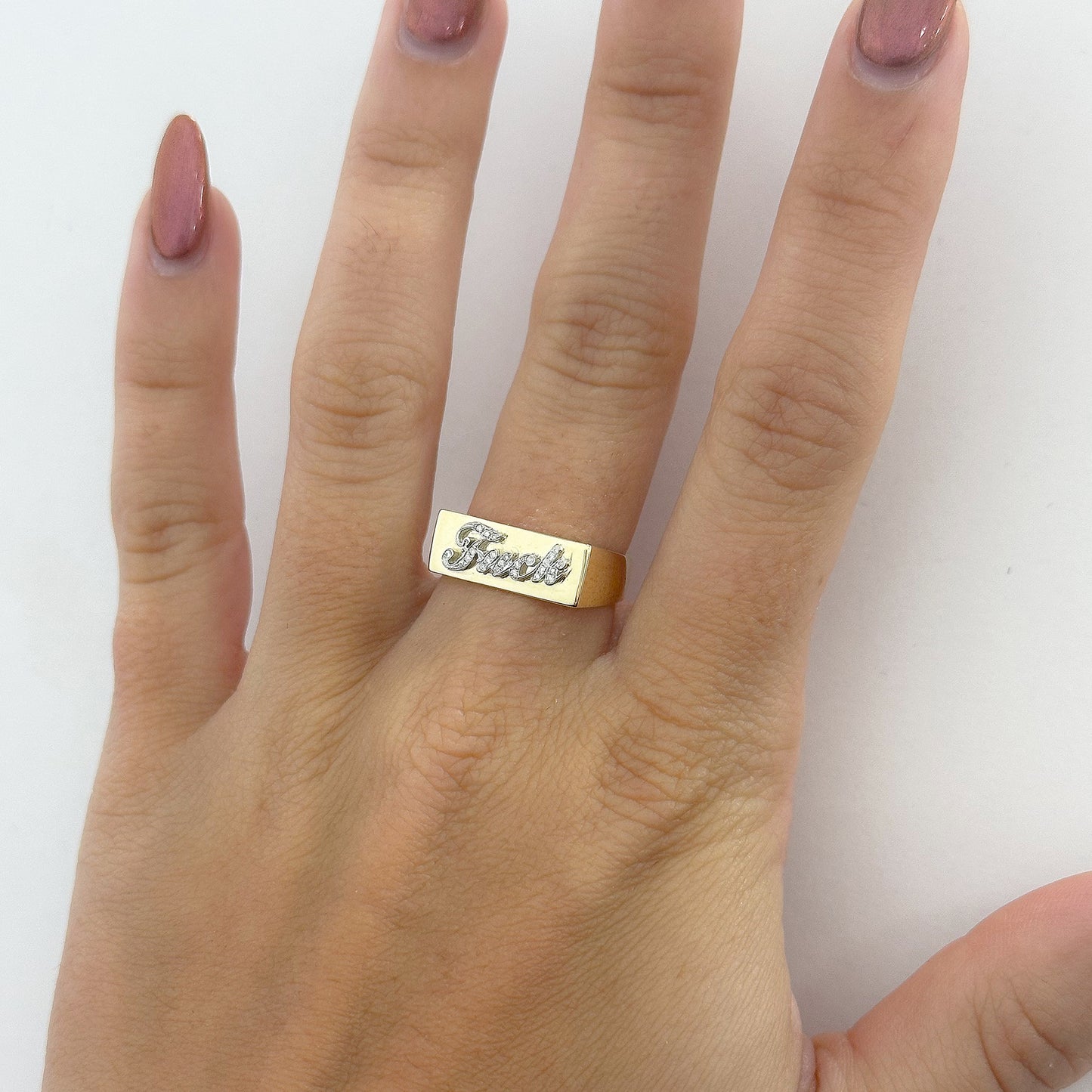 This signet ring features a rectangular design crafted from solid 14K gold and showcases a raised "Fuck" nameplate, adorned with genuine natural diamonds of GVS1 quality. The ring is fully solid, with no hollow sections inside.
