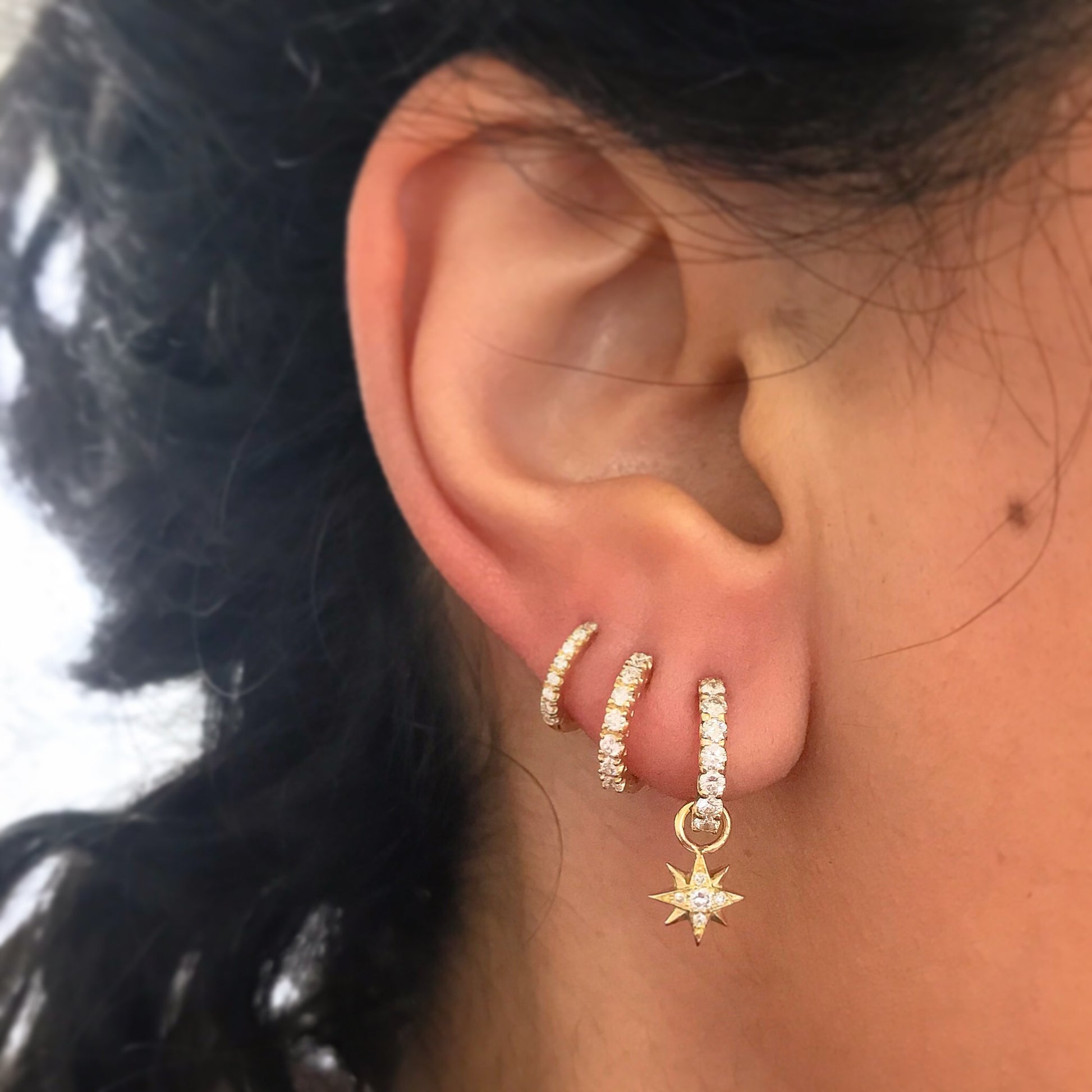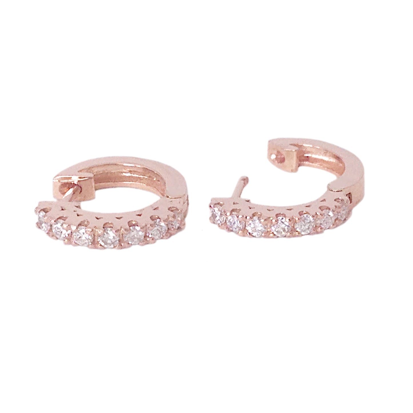 This pair of huggie hoop dangle earrings is composed of 14K solid gold and GVs1 quality round brilliant cut natural real Diamonds. This classic earring features a secure hinged closure for the ease of taking them on and off.