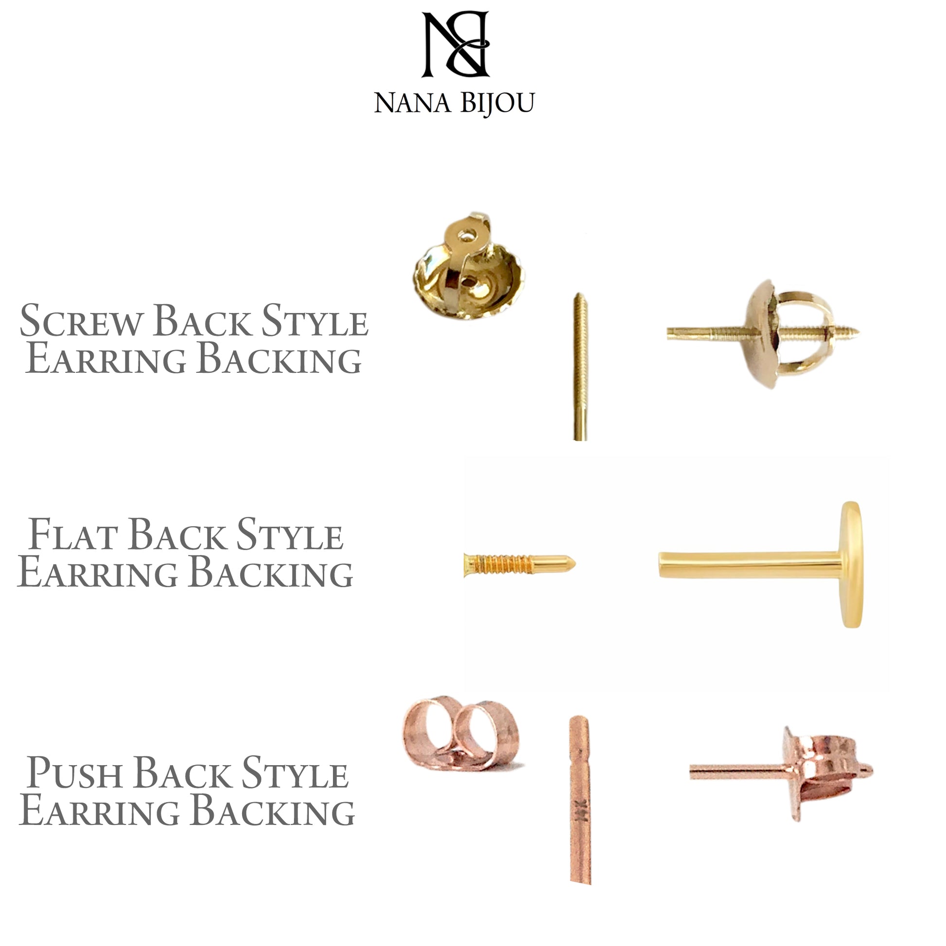 - Backing Type: your choice of Push Back, Flat Back or Screw Back style backings