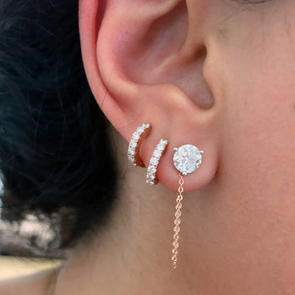 This pair of huggie hoop dangle earrings is composed of 14K solid gold and GVs1 quality round brilliant cut natural real Diamonds. This classic earring features a secure hinged closure for the ease of taking them on and off.