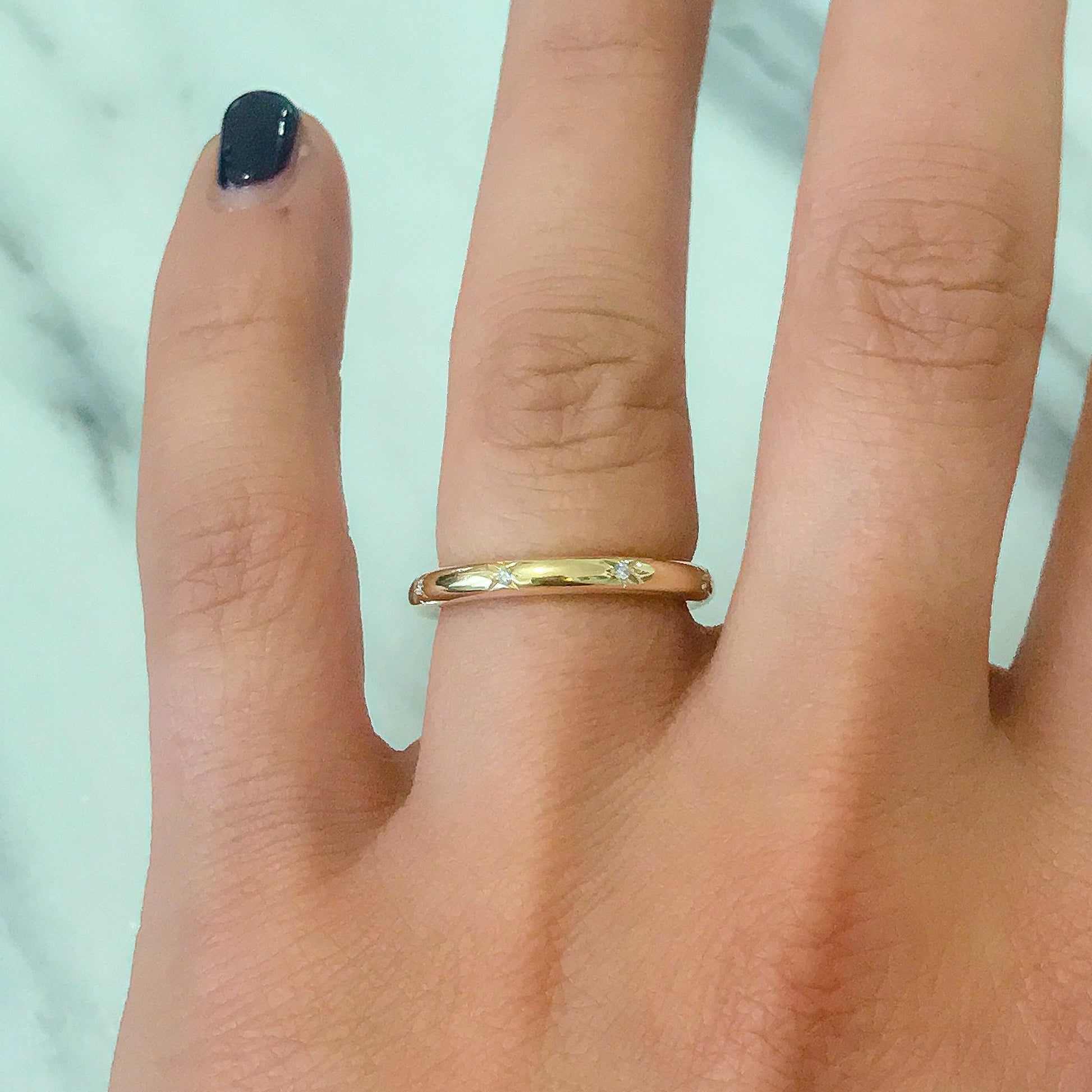 This finely handcrafted ring is made completely of 14K solid gold and accented with star set GVs1 quality natural real Diamonds around the entire ring.