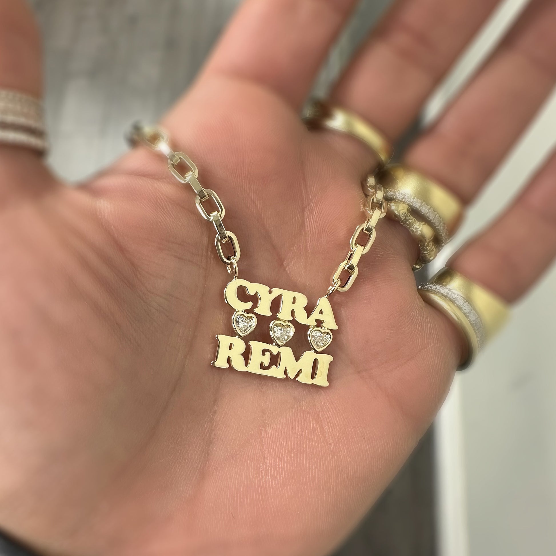 This distinctive double name necklace features a personalized block font cut-out design crafted from 14K solid gold. It is elegantly accented with three bezel-set, heart-shaped natural real diamonds of GVS1 quality. The pendant comes with our small size oval rolo link chain, or can be purchased as a charm alone. Customization options are available for different chain styles—please contact us for personalized assistance.