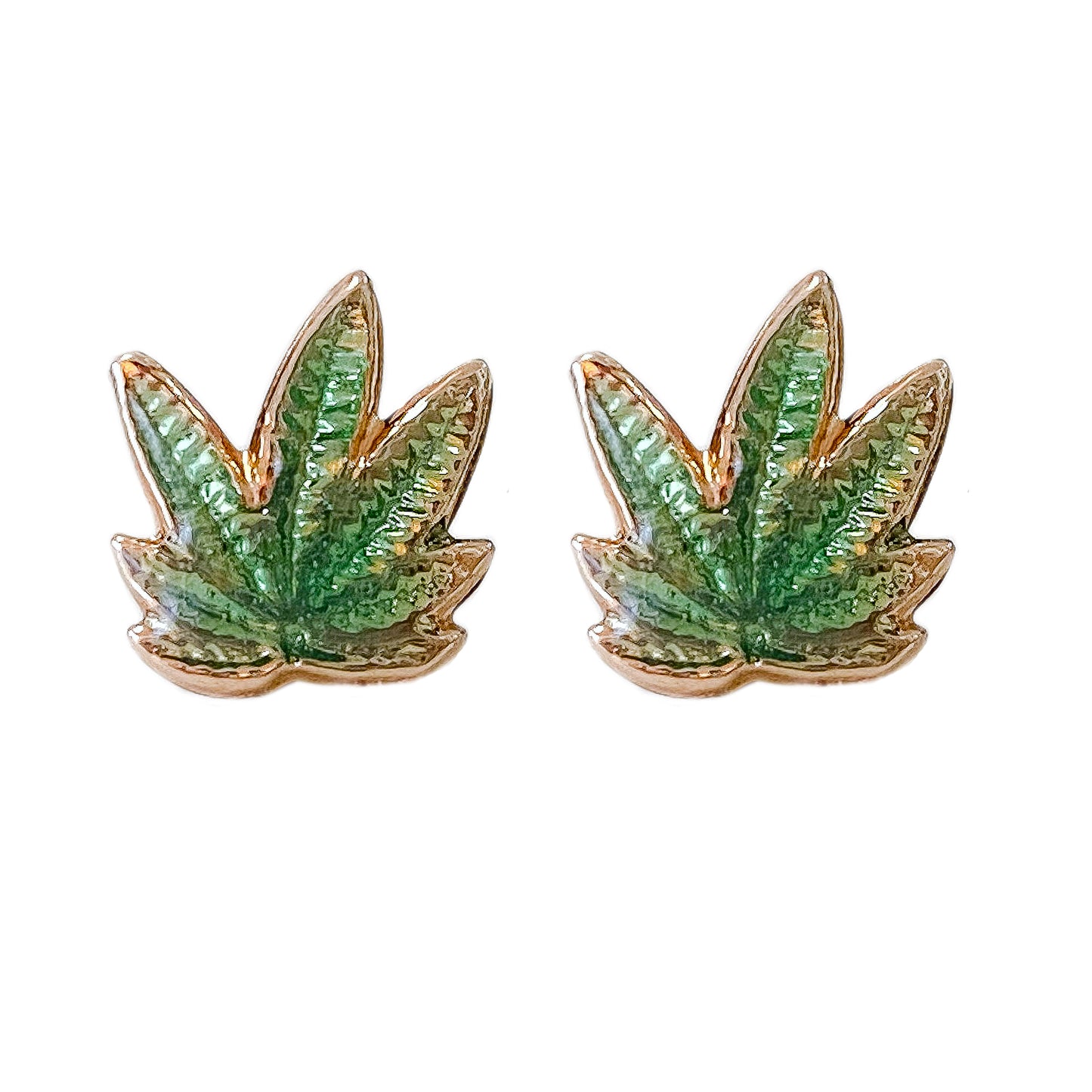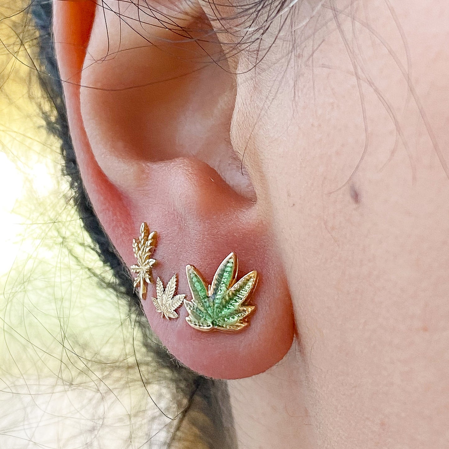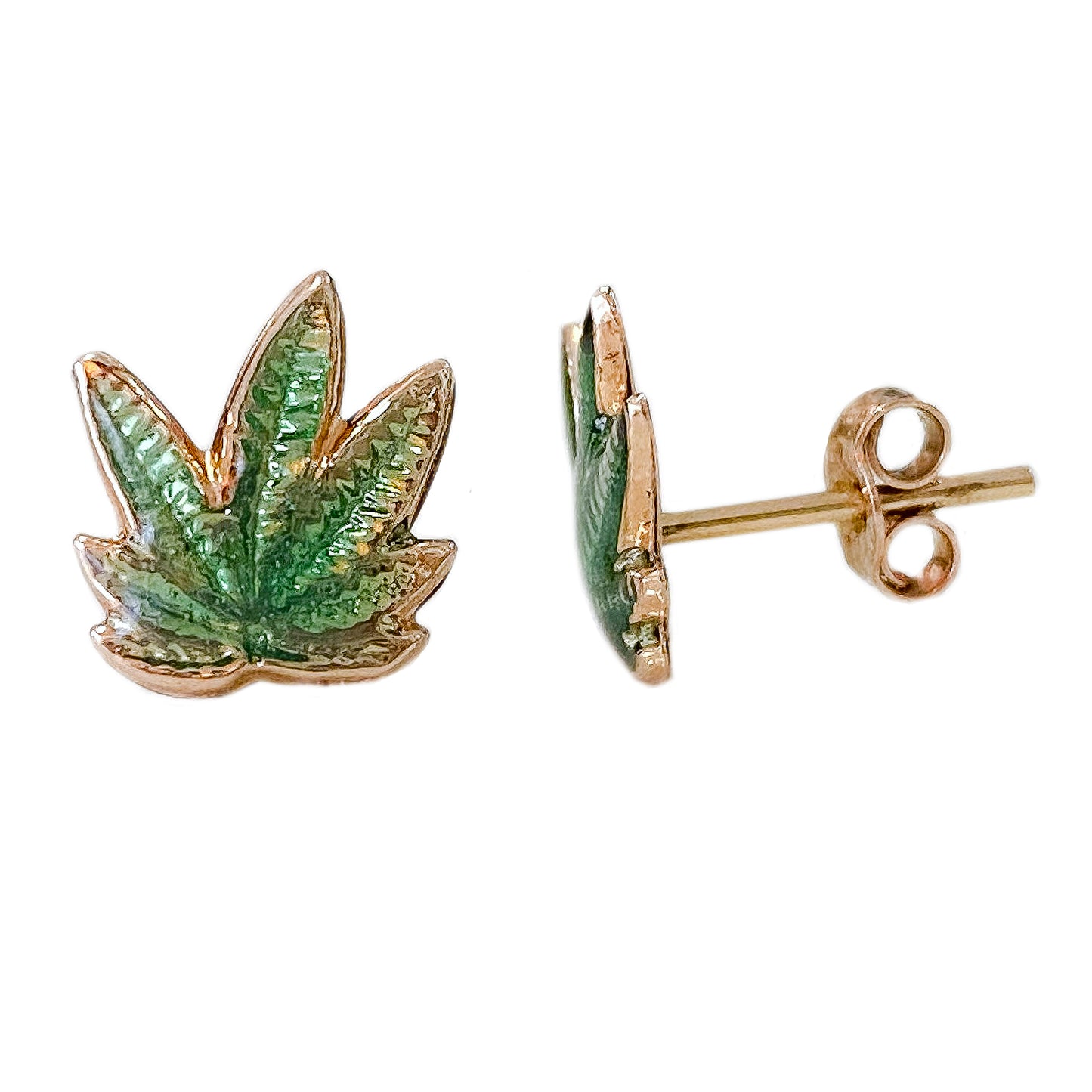 14K Gold Enameled Marijuana Leaf Stud Earrings