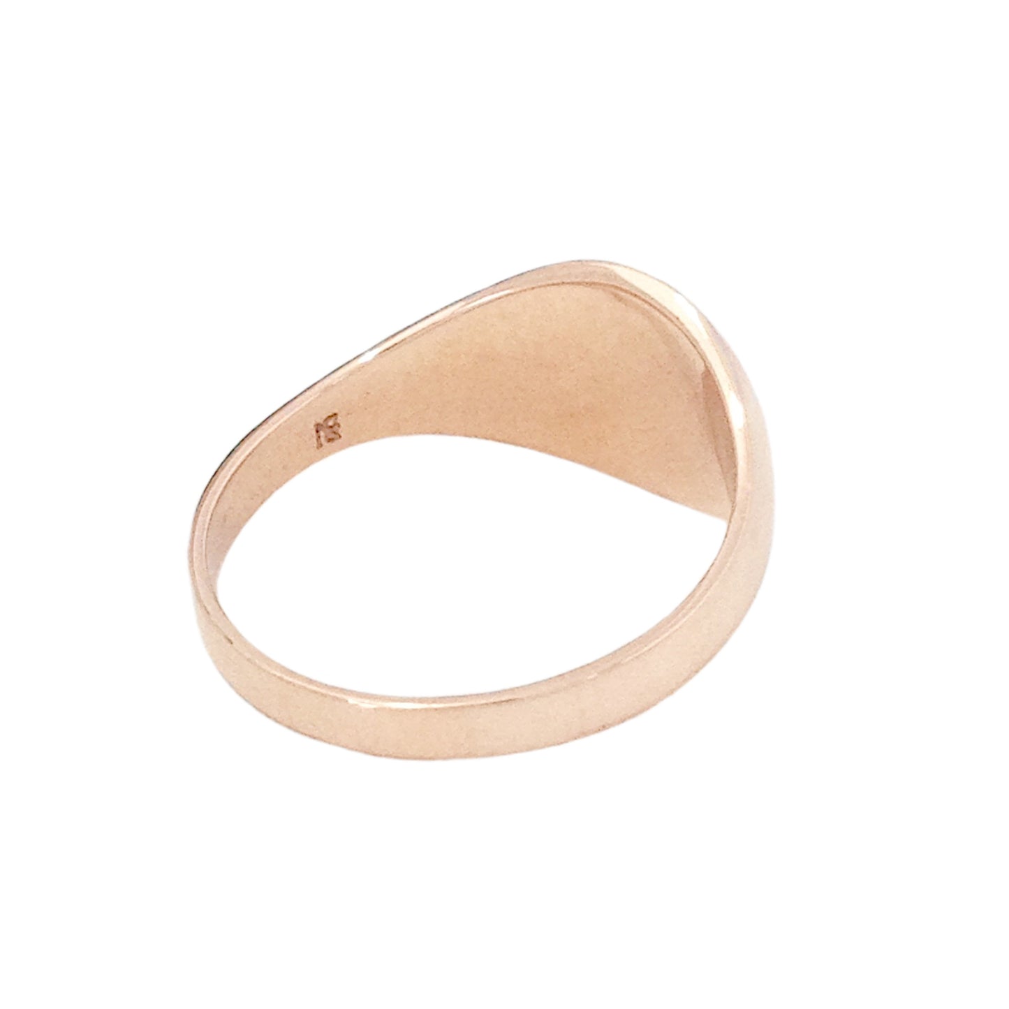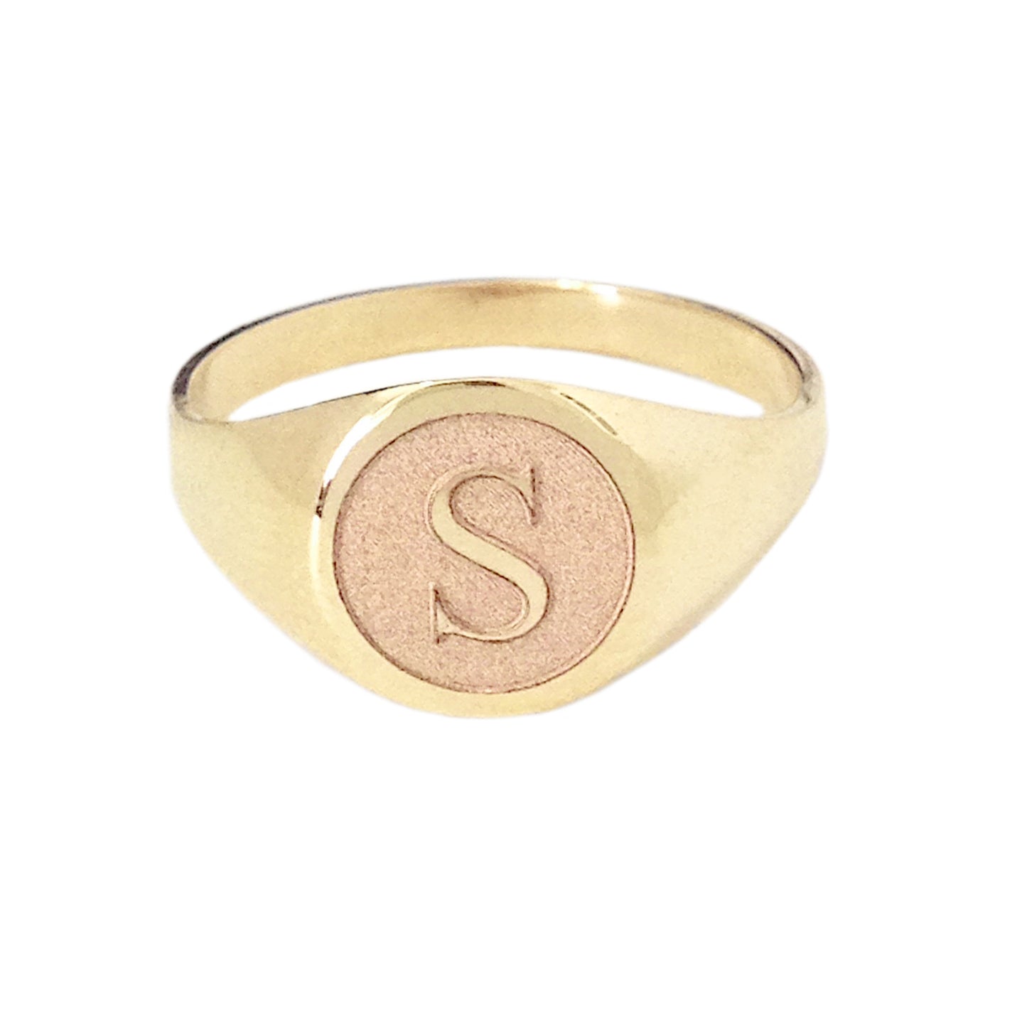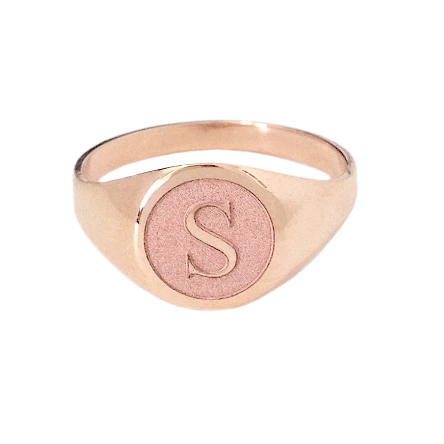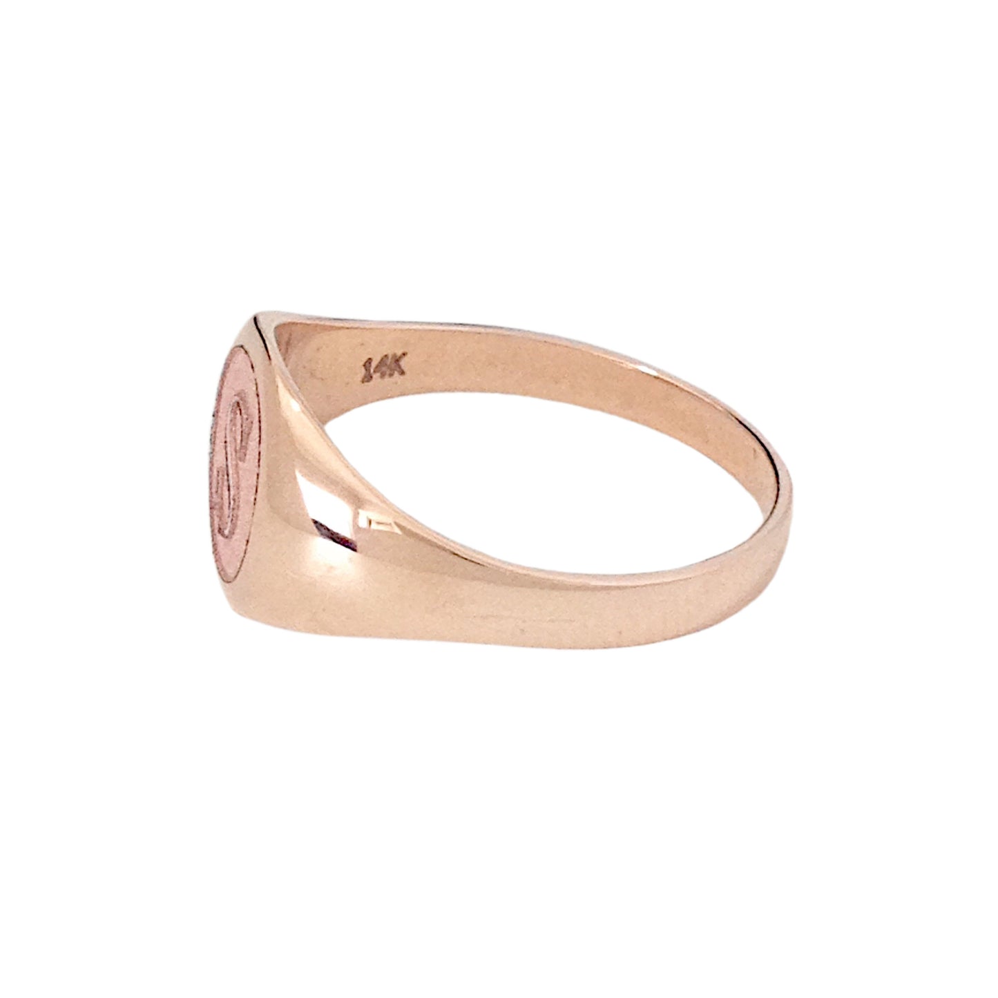 This traditional signet style ring is composed of 14K solid gold & uniquely finished with a raised cameo style engraving of any initial letter desired. This ring is the perfect unique addition to your ring collection.