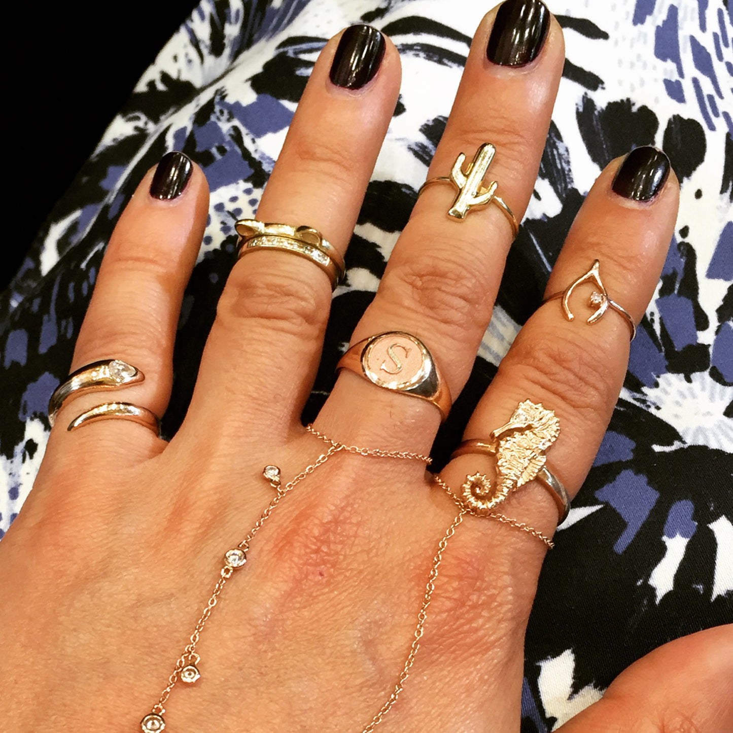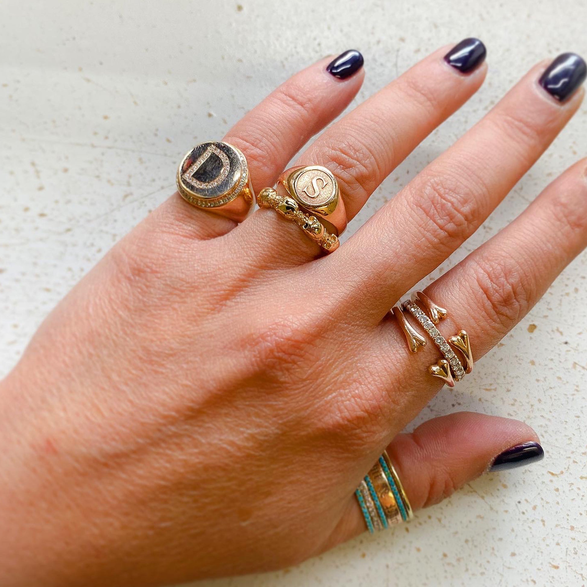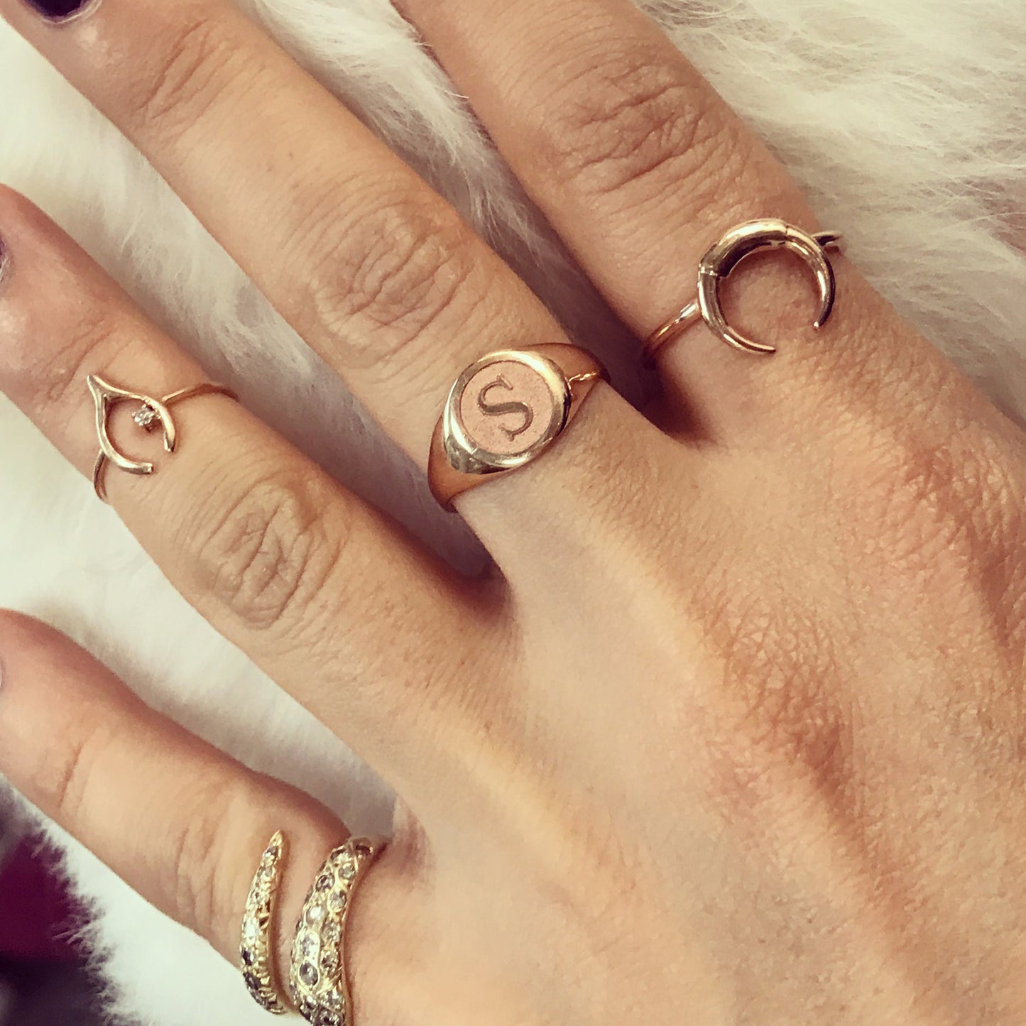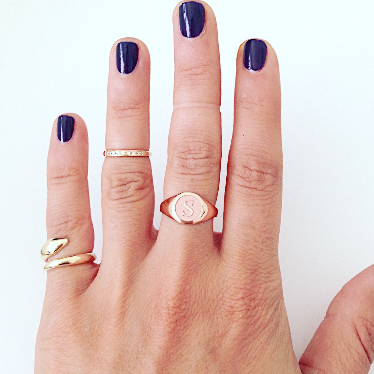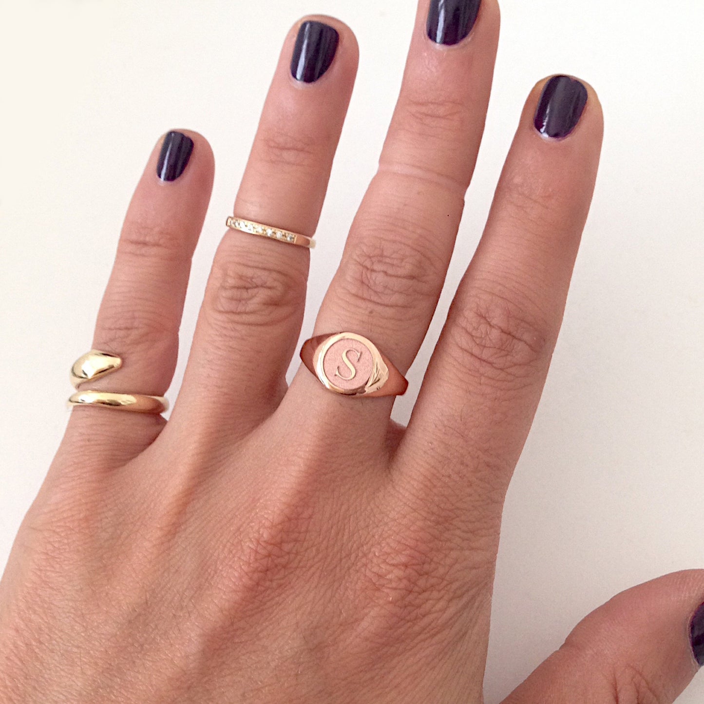 This traditional signet style ring is composed of 14K solid gold & uniquely finished with a raised cameo style engraving of any initial letter desired. This ring is the perfect unique addition to your ring collection.