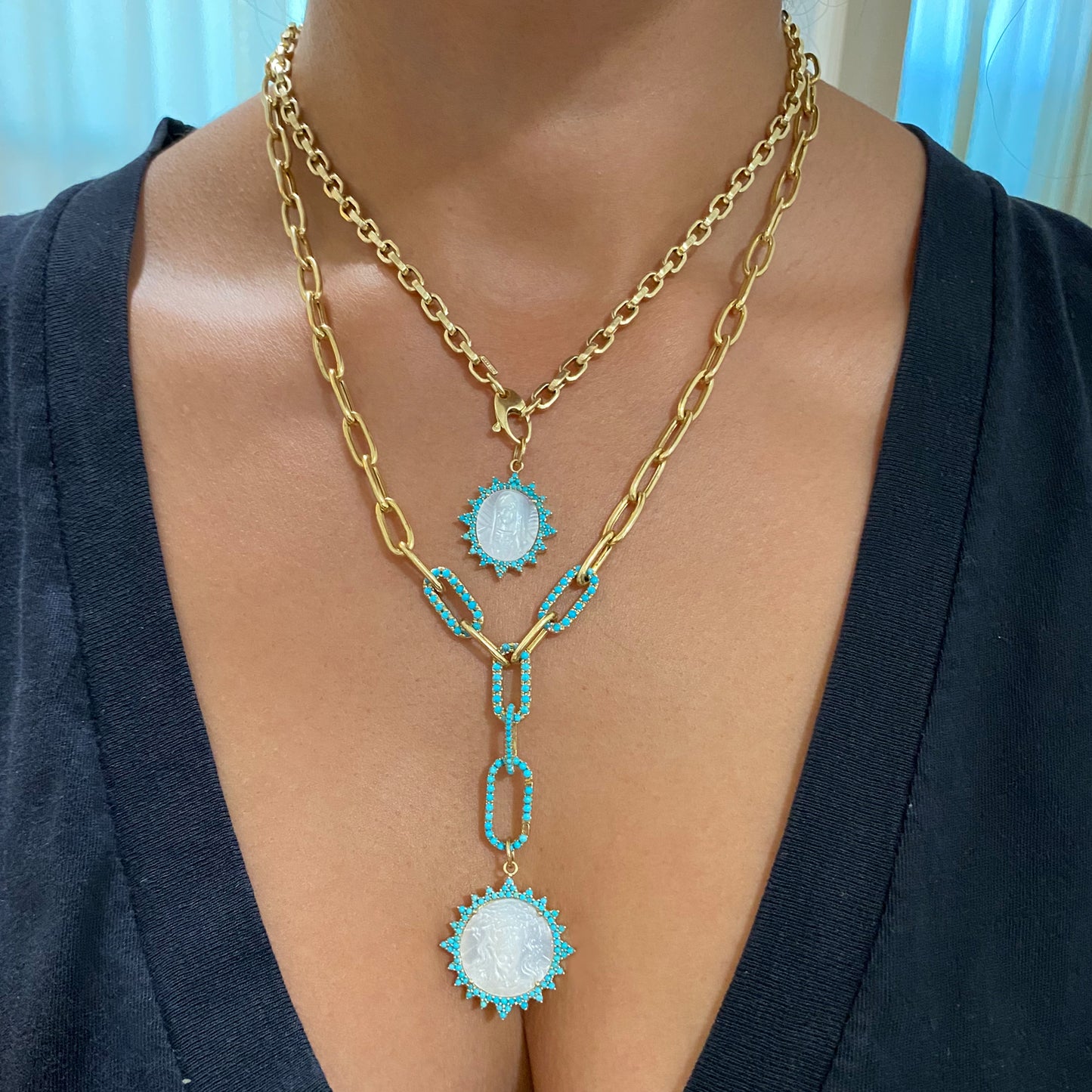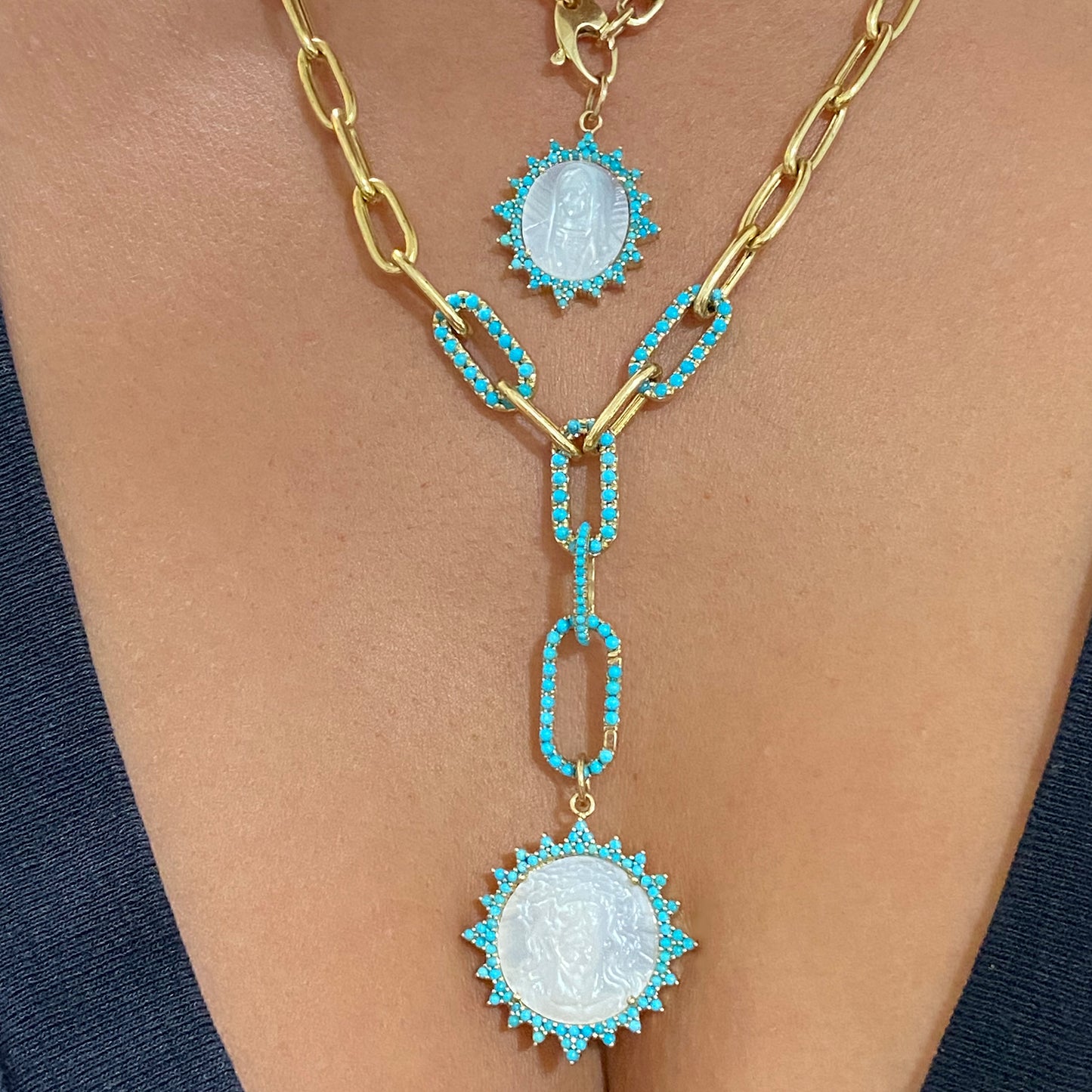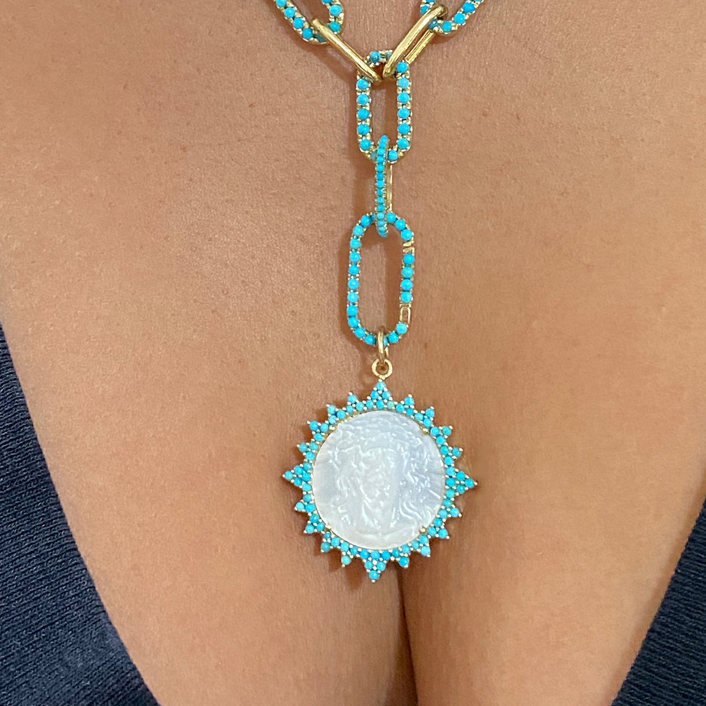 This unique limited edition design is composed of 14K solid gold and beautifully complemented with pavé set genuine AAA quality round cabochon cut natural real Turquoise gemstones surrounding a hand carved Mother of Pearl Jesus Christ cameo. This pendant is sold as a charm alone without the chain and can be combined with any of our popular chain options.