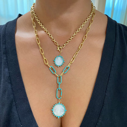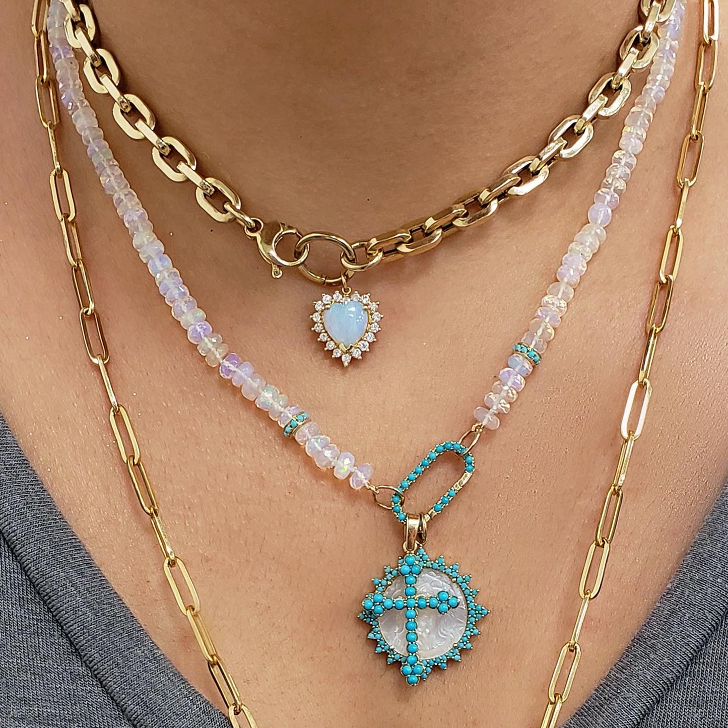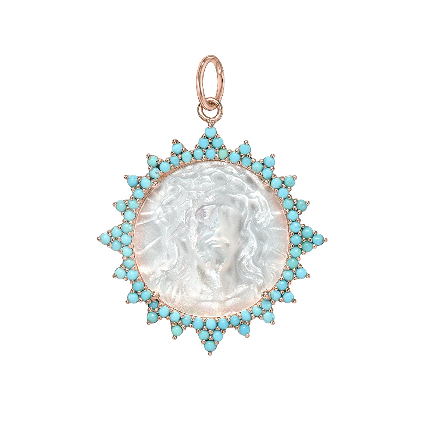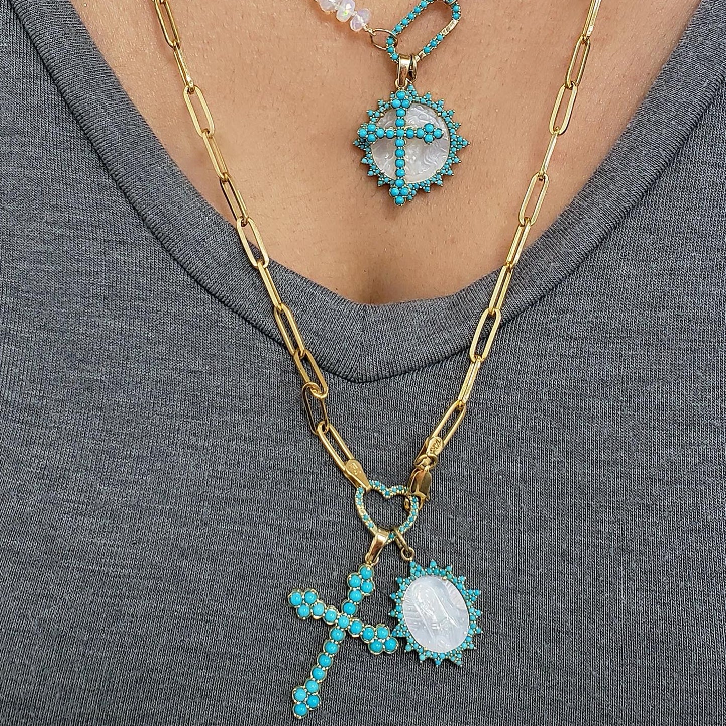 14K Gold Jesus Christ Miraculous Medal Mother of Pearl & Starburst Pavé Turquoise Charm Pendant, LIMITED EDITION