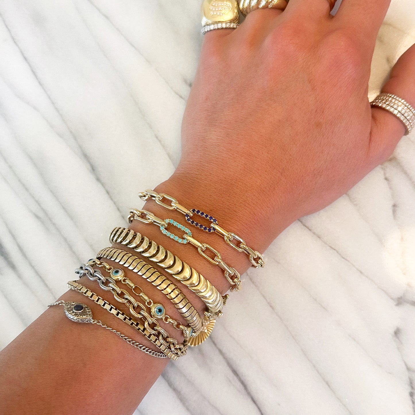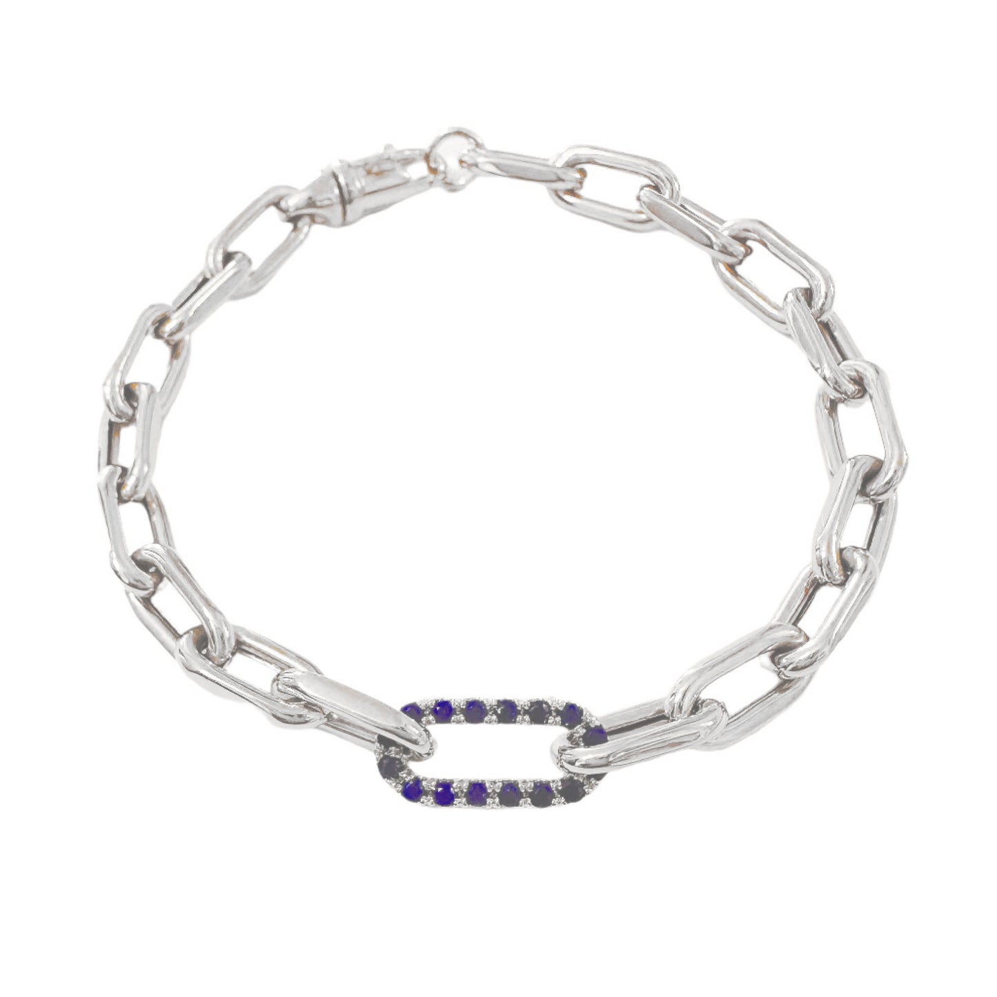This Italian handcrafted chain link bracelet is completely composed of 14K solid gold and is uniquely made with a semi-hollow interior for comfortable everyday wear that will not dent. The chain is centered with a slightly larger link and is pavé set on BOTH SIDES with round brilliant cut genuine AAA quality natural real lapis lazuli gemstones. This bracelet is available in a variety of length options.