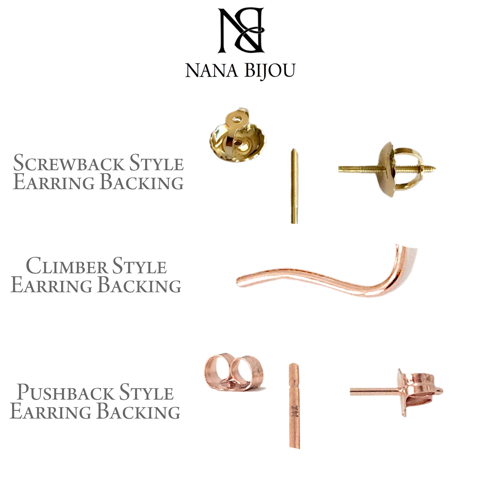 - Backing Type: your choice of Push Back, Flat Back, Screw Back or Climber Back style backings