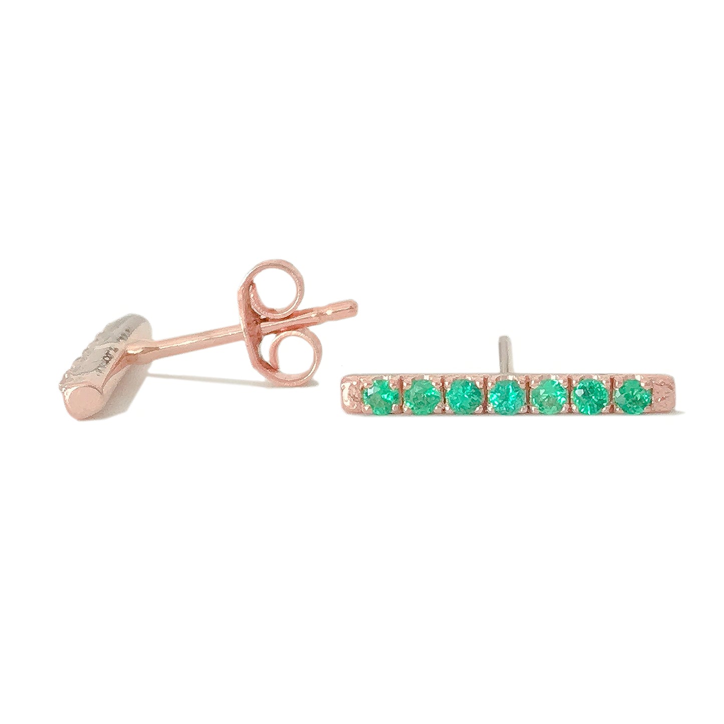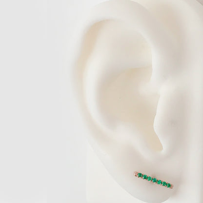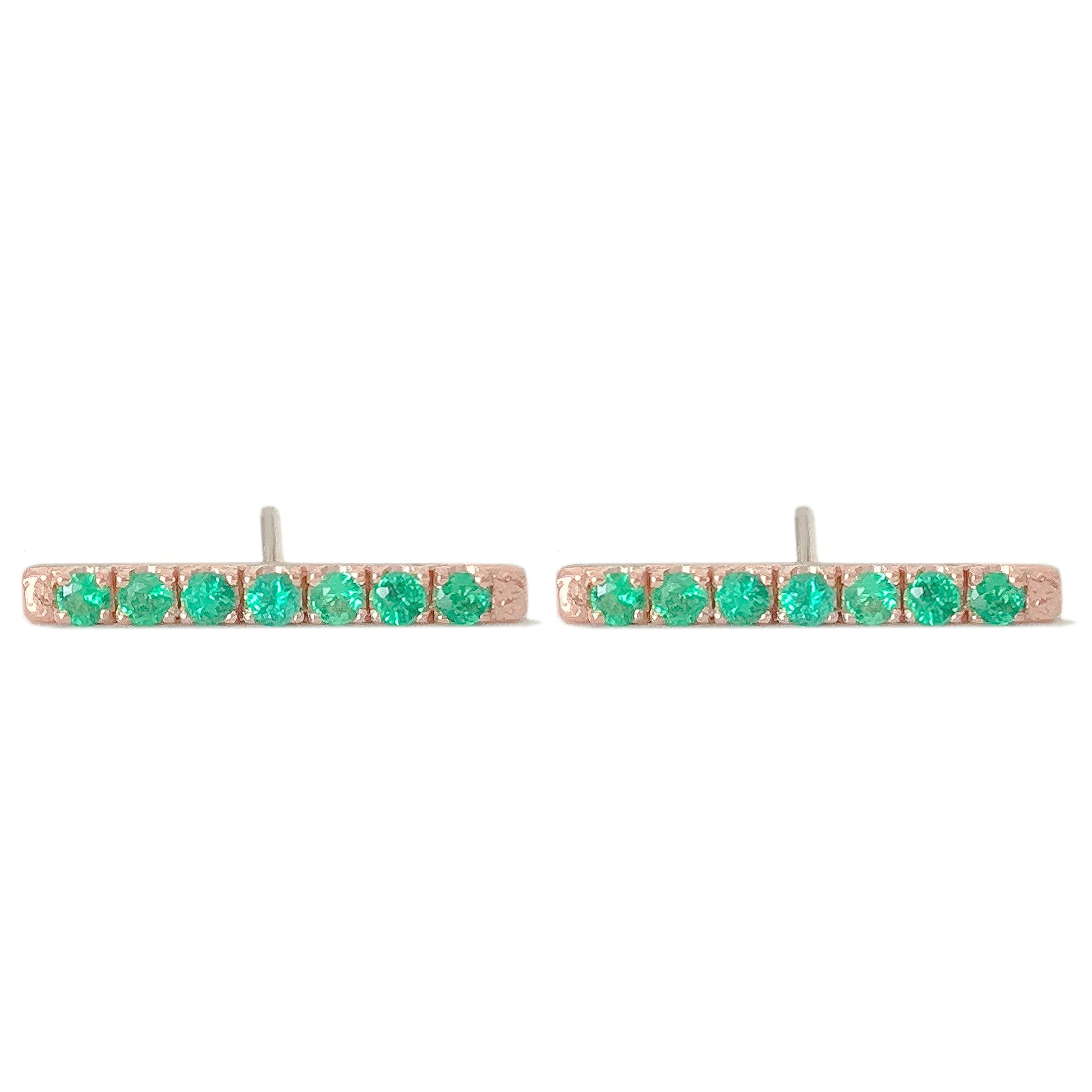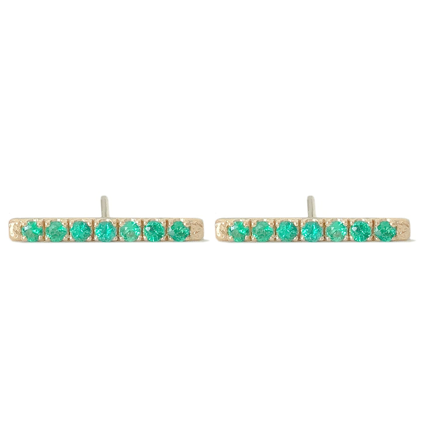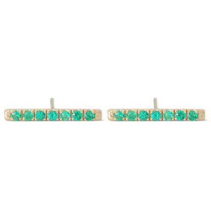 This finely handcrafted pavé Emerald bar stud earring is composed of 14K solid gold and AAA quality round brilliant cut genuine Emerald gemstones. These beautiful earrings come with matching 14K solid gold backings.