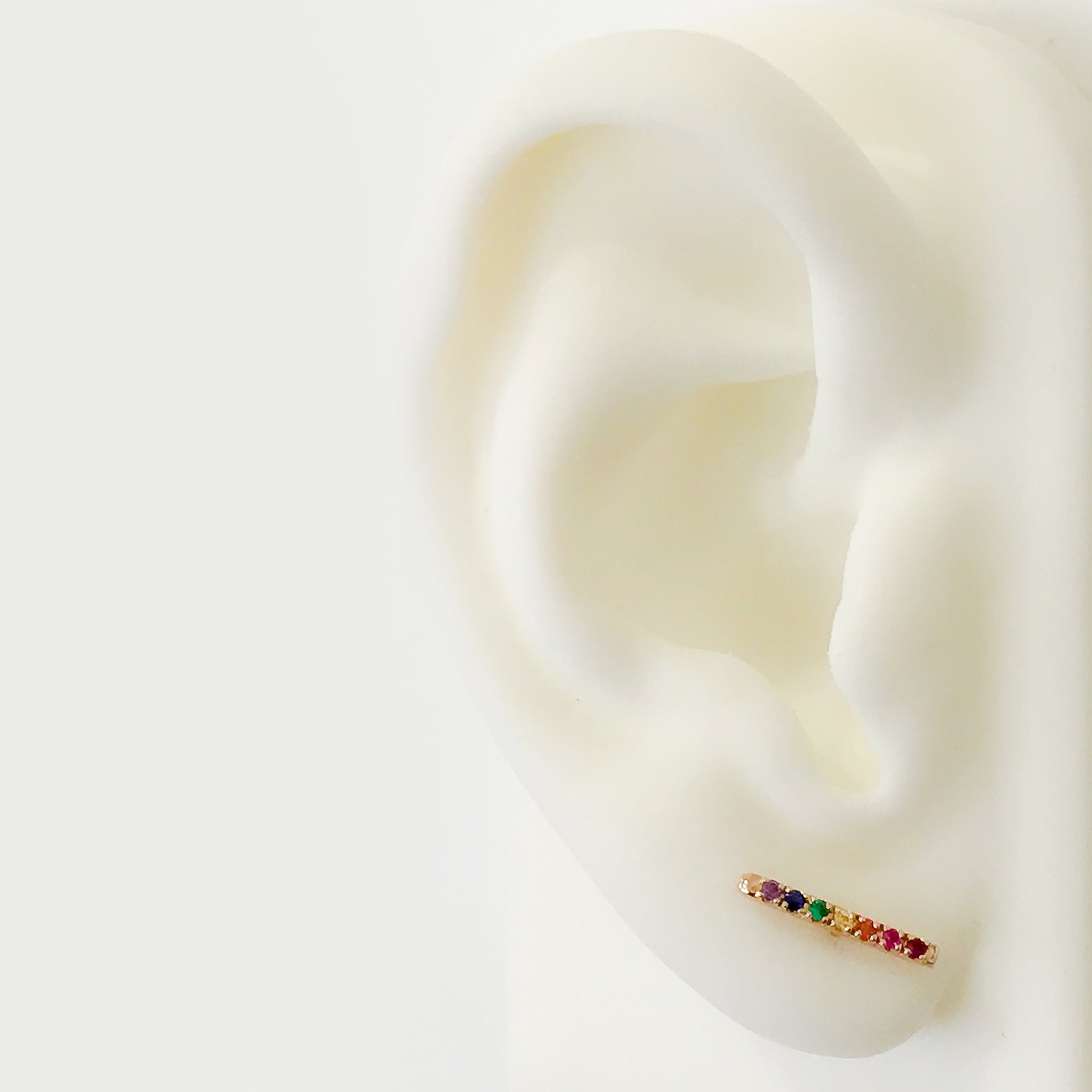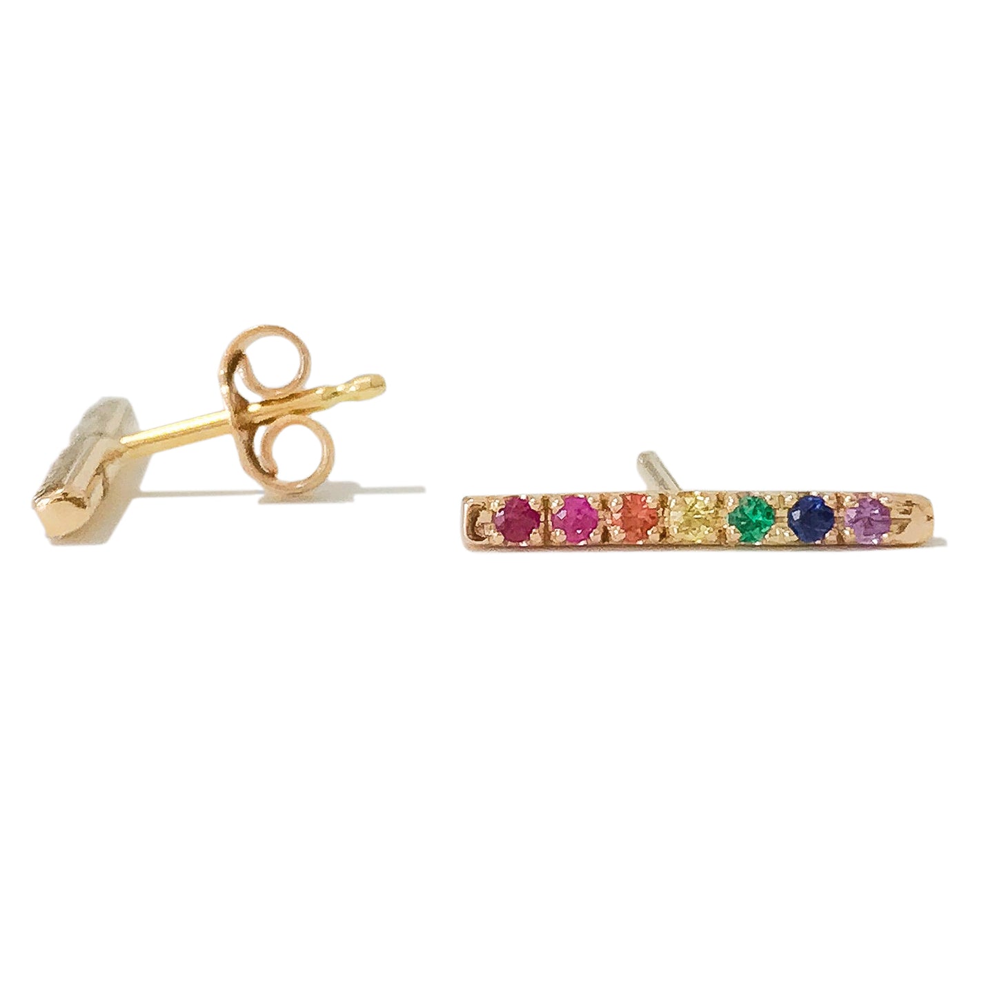 This unique rainbow gemstone bar stud earring is composed of 14K solid gold and AAA quality round brilliant cut ruby, pink sapphire, orange sapphire, yellow sapphire, emerald, blue sapphire and amethyst. These beautiful earrings come with matching 14K solid gold backings.