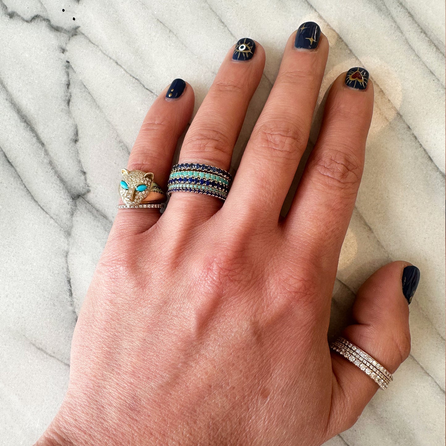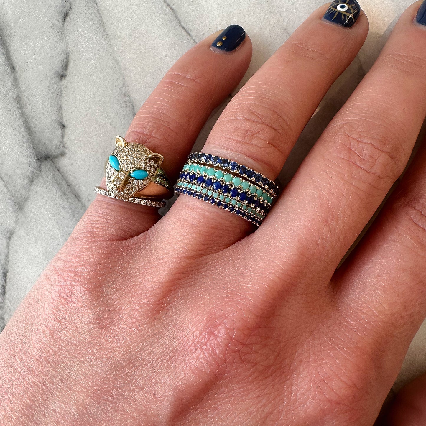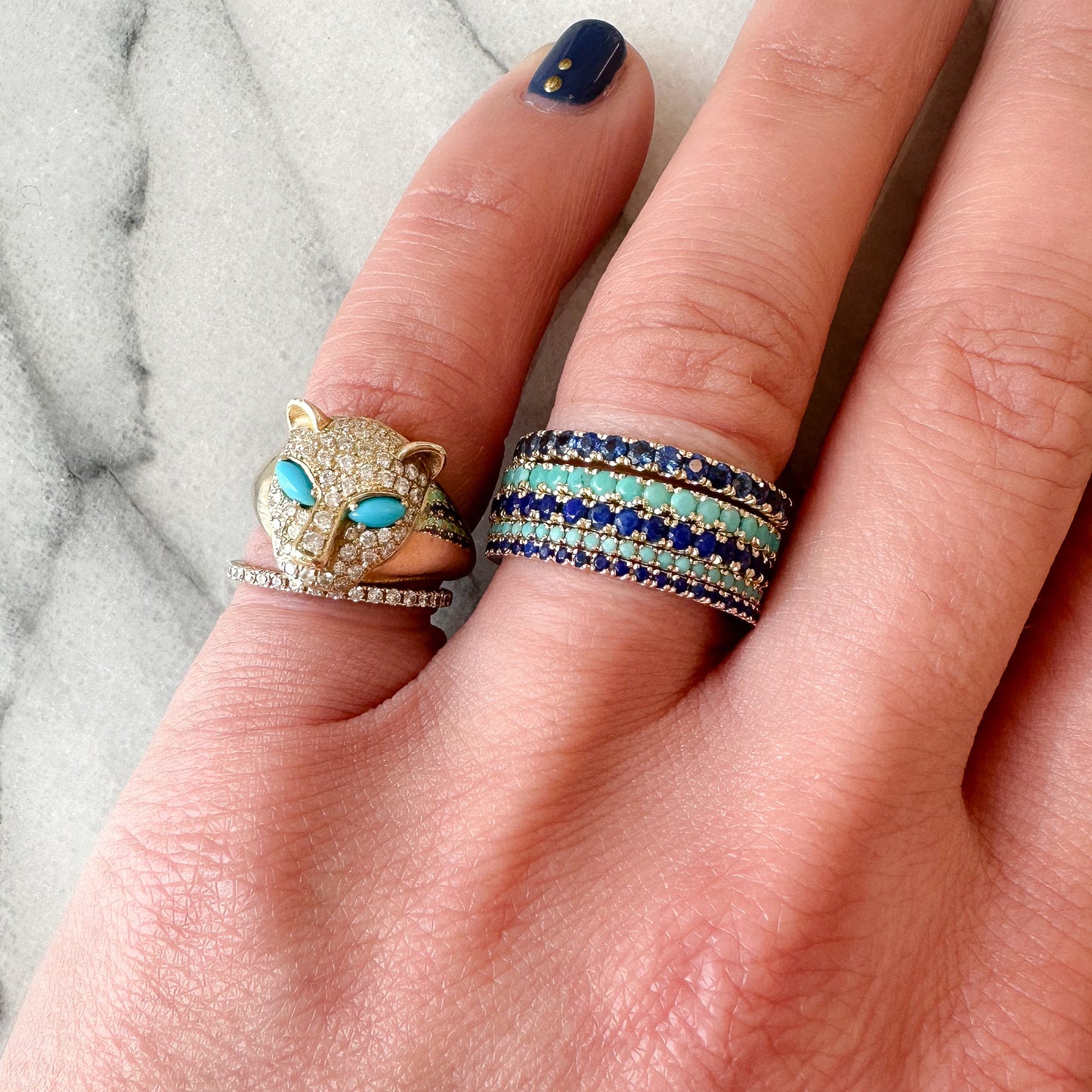 This finely handcrafted ring is made completely of 14K solid gold and micro pavé set with genuine AAA quality round brilliant cut natural real turquoise gemstones. Perfect for stacking.