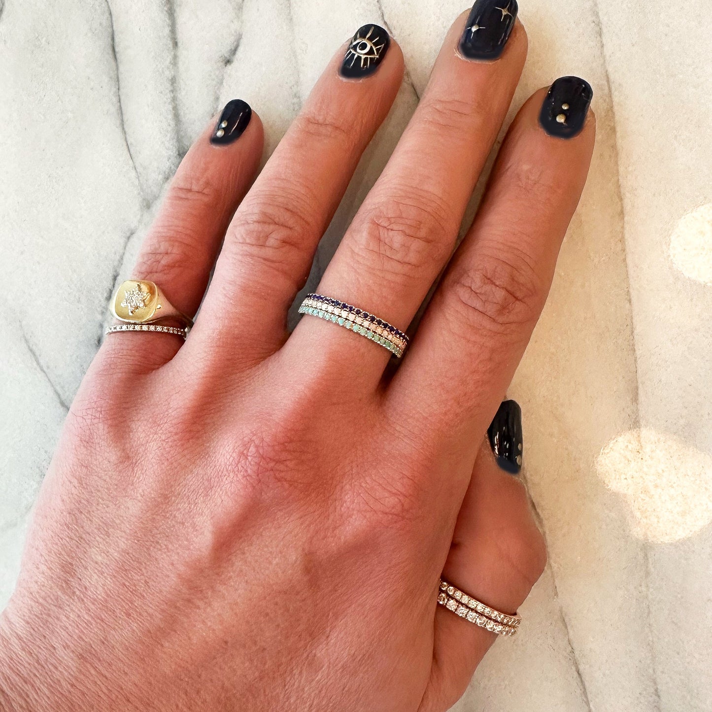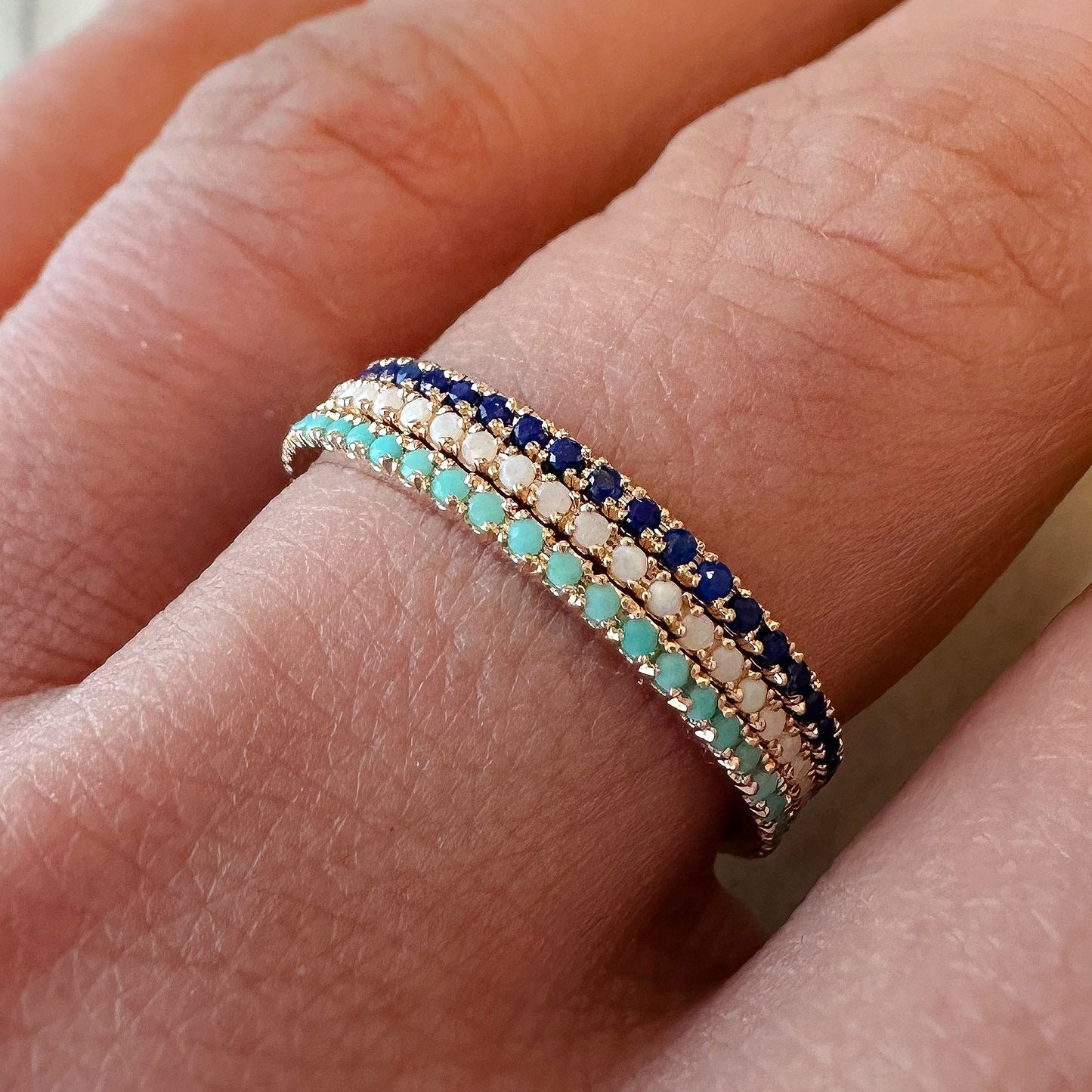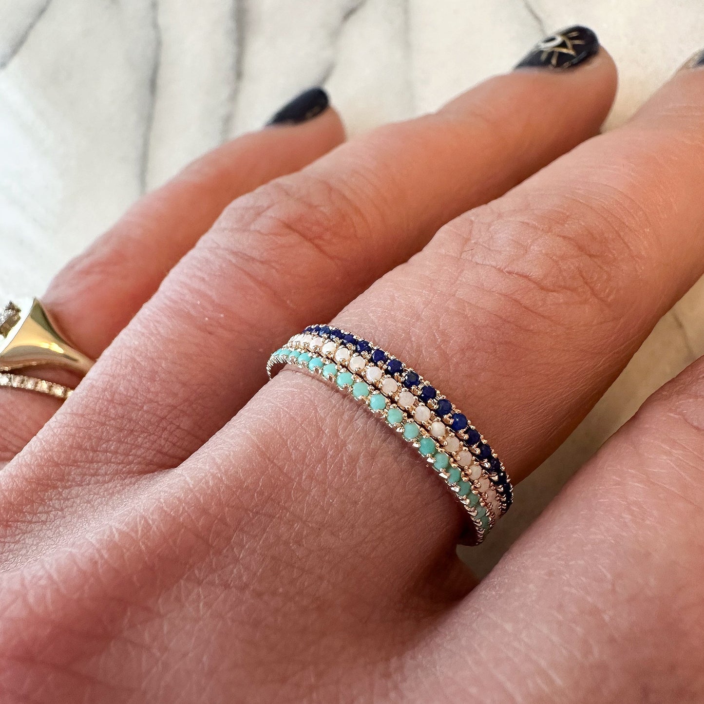 This finely handcrafted ring is made completely of 14K solid gold and micro pavé set with genuine AAA quality round brilliant cut natural real turquoise gemstones. Perfect for stacking.