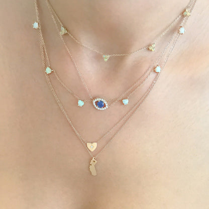 This finely handcrafted necklace is composed of genuine AAA quality round cabochon cut real natural Australian Opal gemstones & 14K solid gold. This dainty necklace is beautifully complemented by a delicate yet durable 14K solid gold chain, finished with a secure lobster claw clasp and Nana Bijou signature logo tag. This piece is adjustable in length.