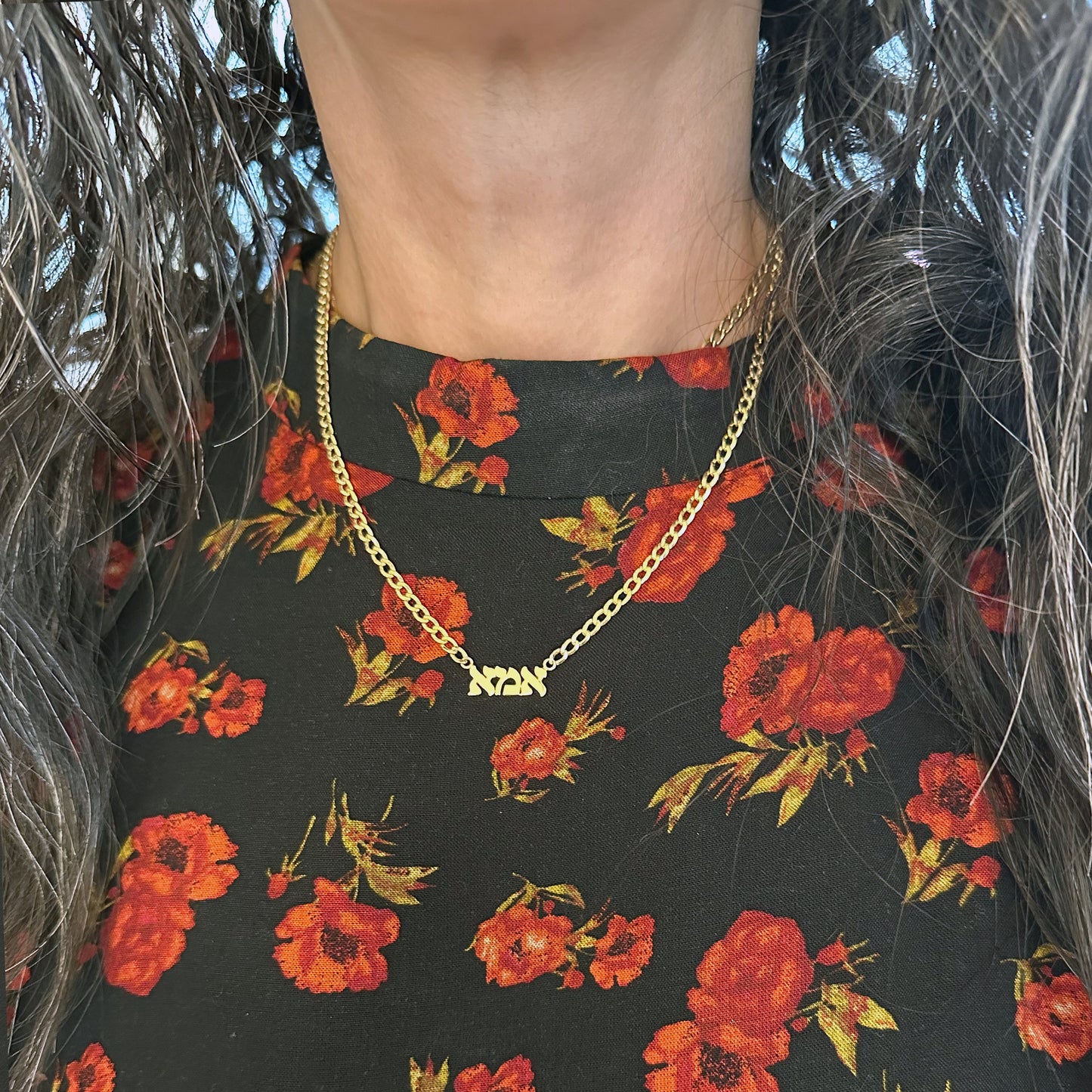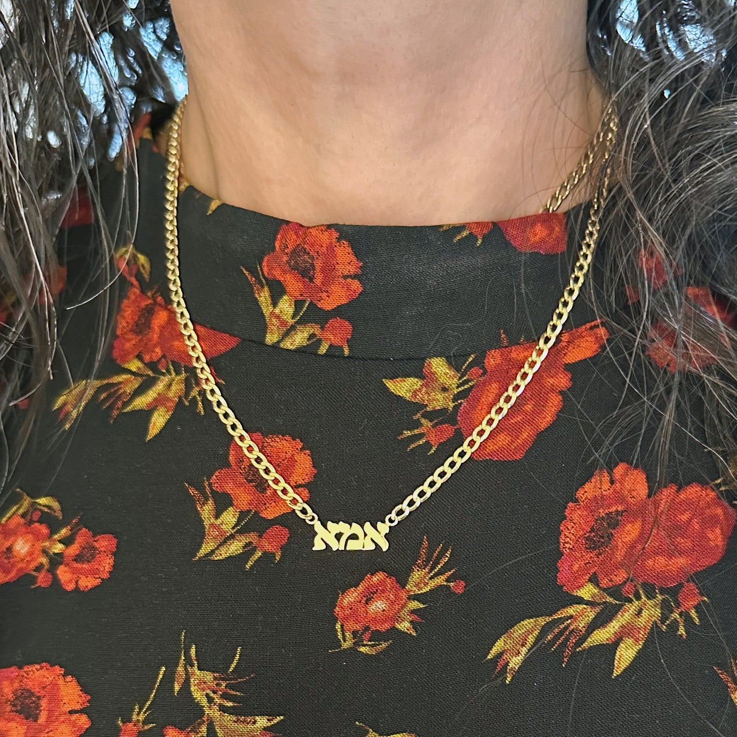 This meticulously made necklace features a Hebrew nameplate that reads "Mother." Handcrafted from solid 14K gold, the pendant is beautifully complemented by our small size open curb link chain.