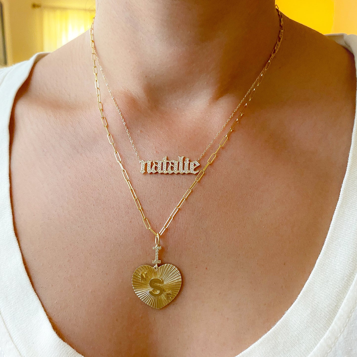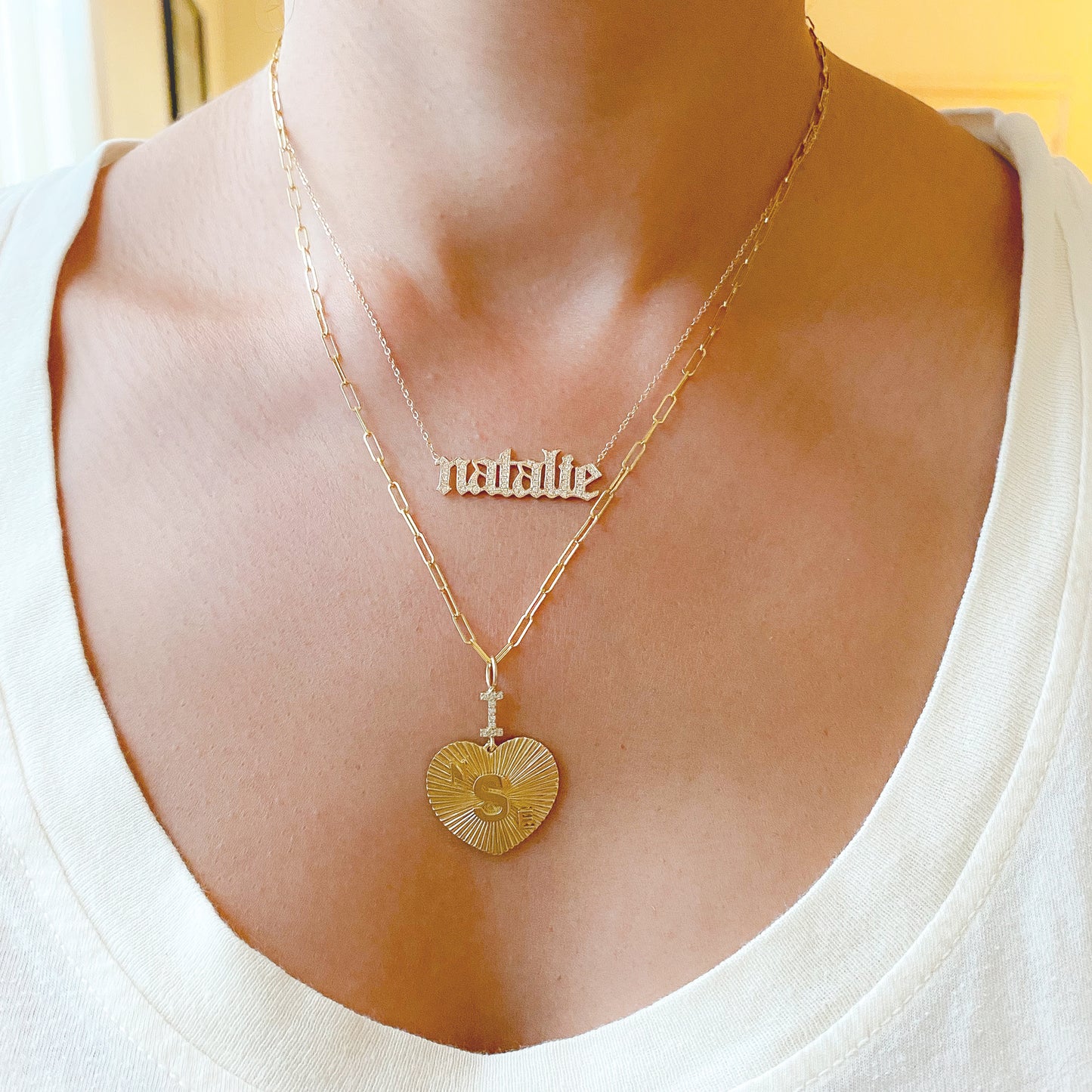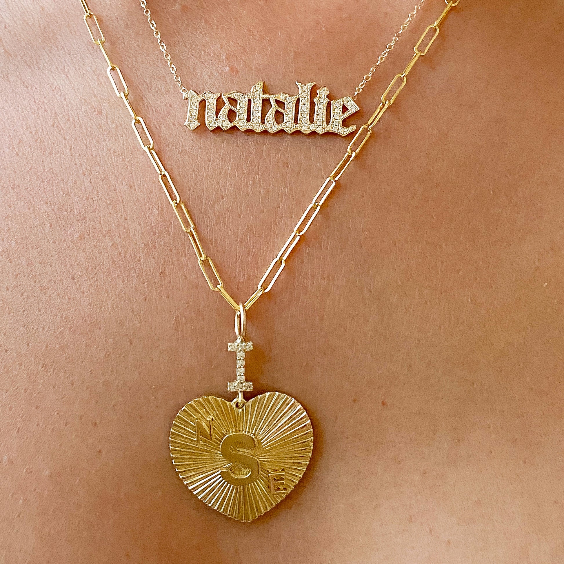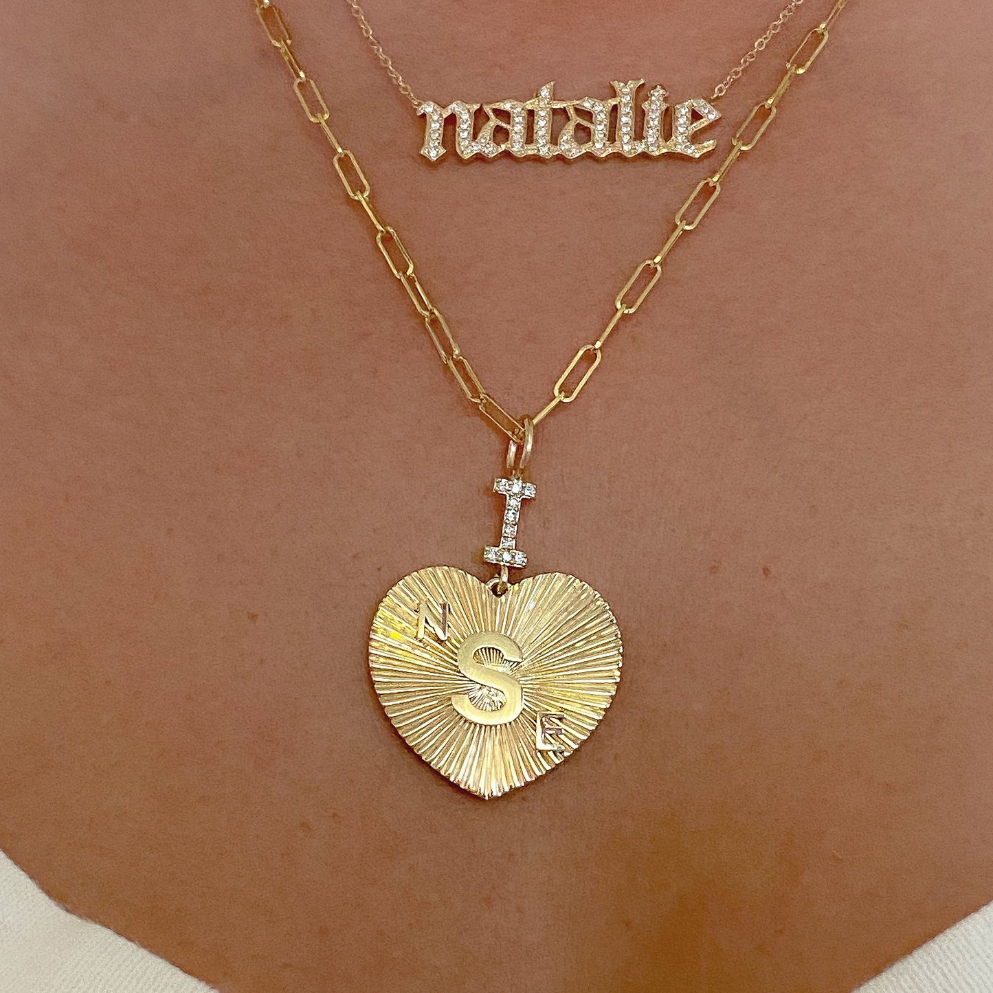 This finely handcrafted necklace is made completely of 14K solid gold which is pavé set with GVs1 quality round brilliant cut natural real Diamonds in the "I" finished with a fluted detail throughout the heart. This pendant is complemented by our 14K solid gold thin elongated oval small size link chain, finished with a secure lobster claw clasp. This item is adjustable in length or available to be purchased as a charm pendant without the chain.