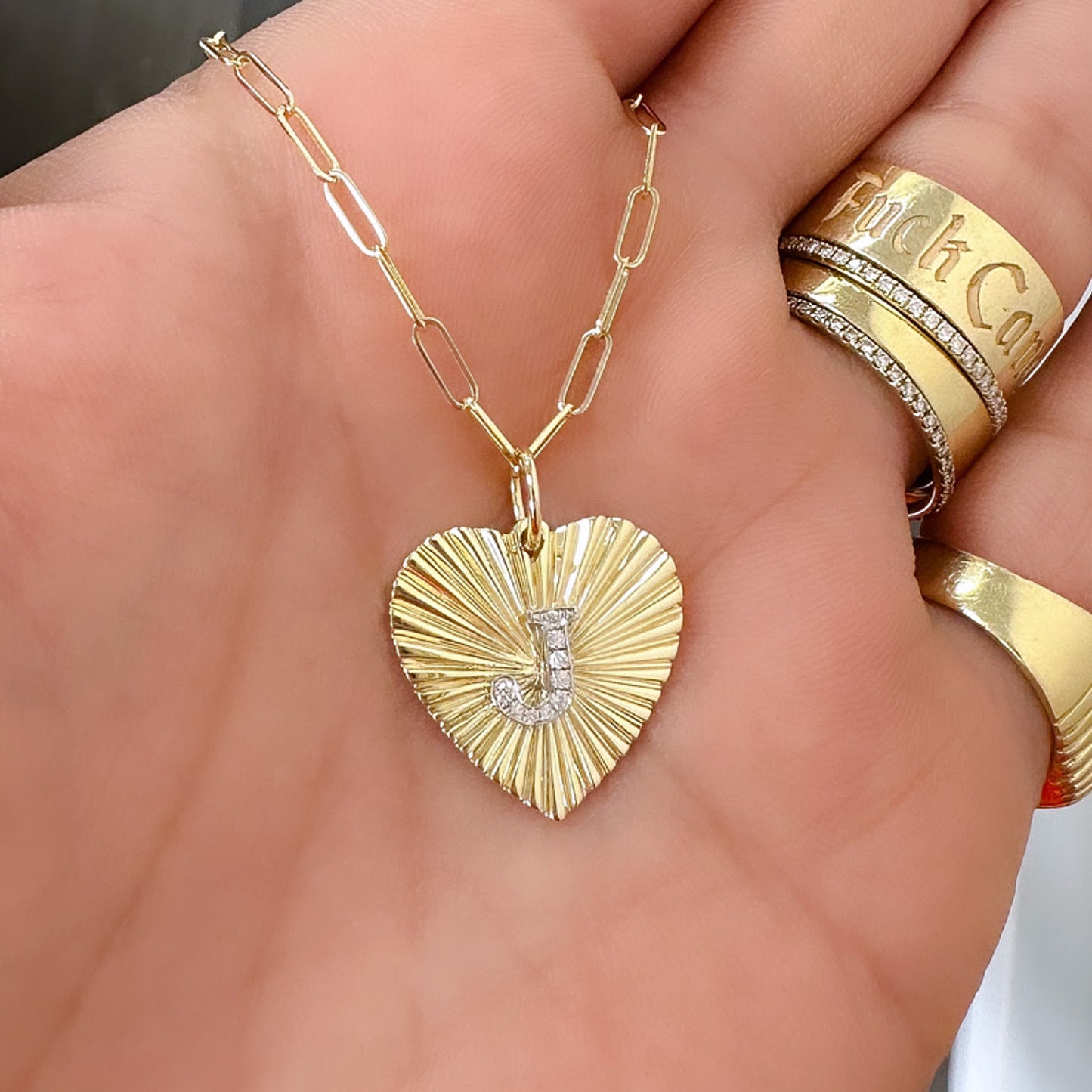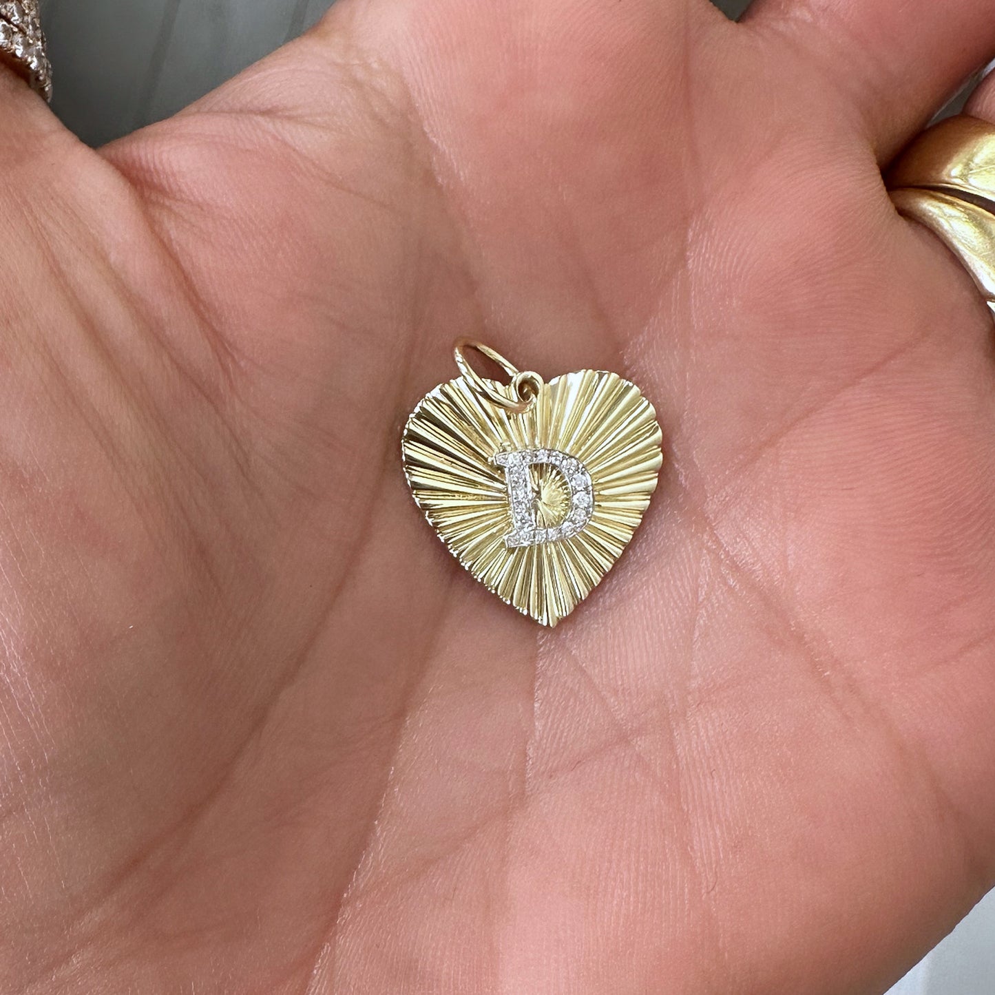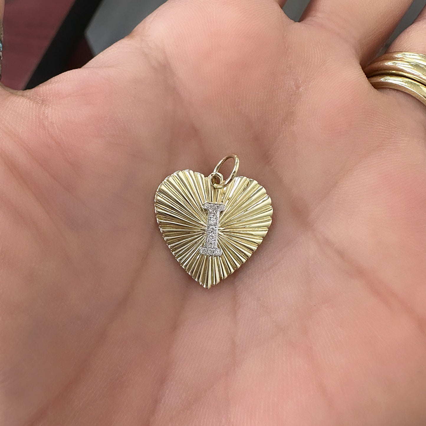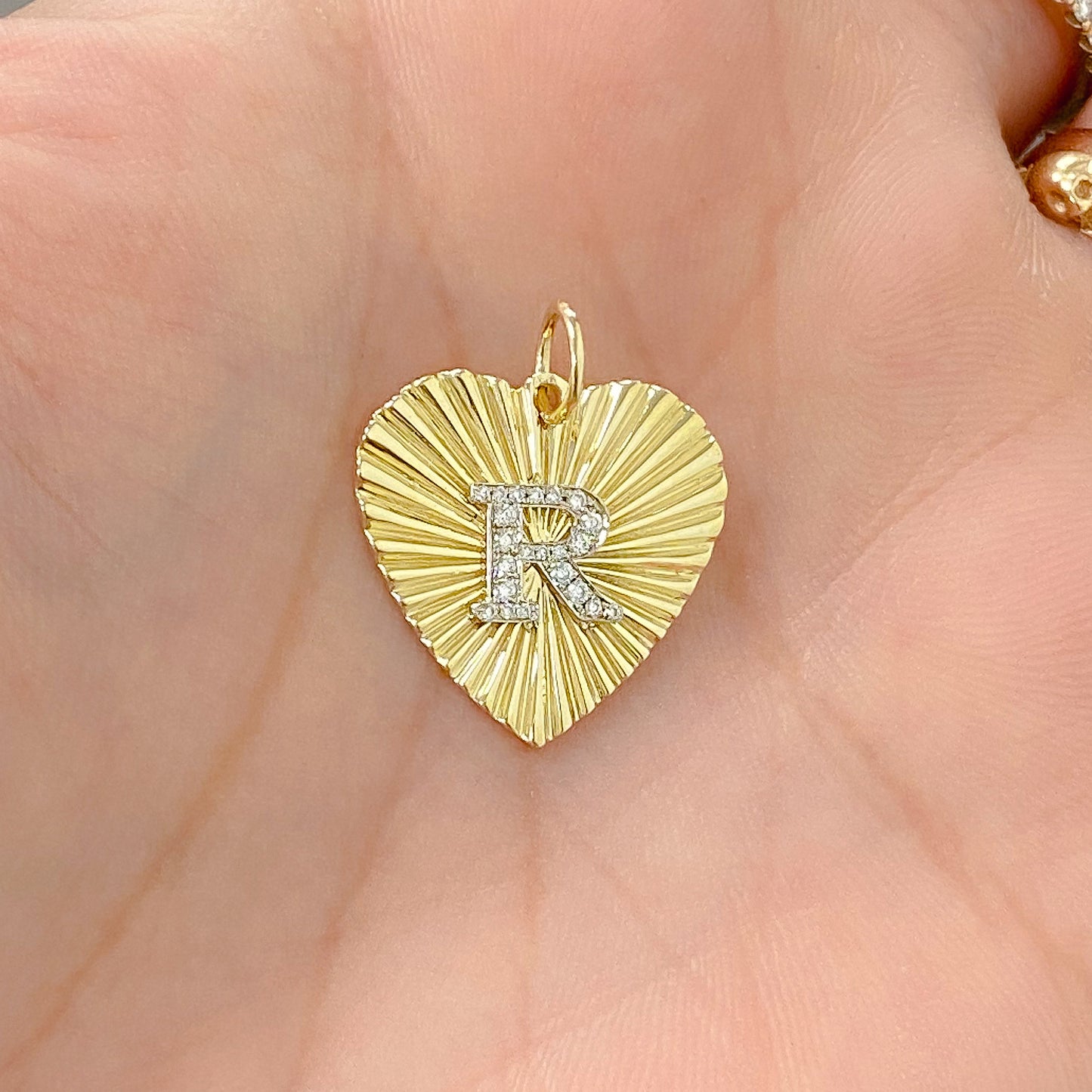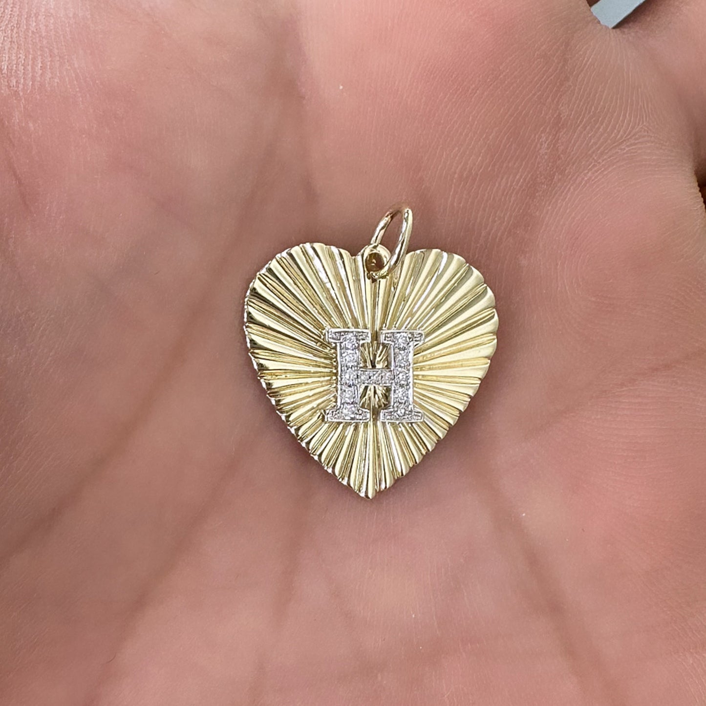 14K Gold Pavé Diamond Initial Fluted Heart Medallion Pendant, Medium Size Heart