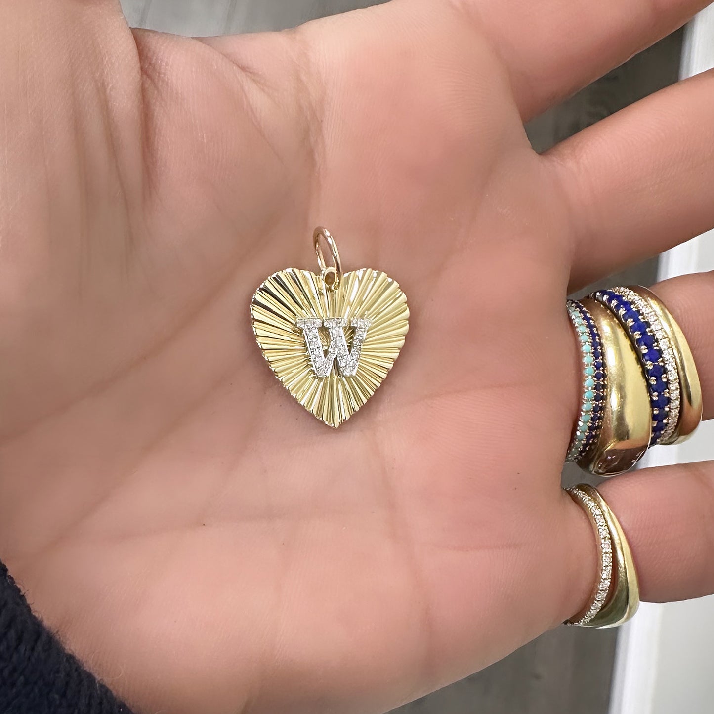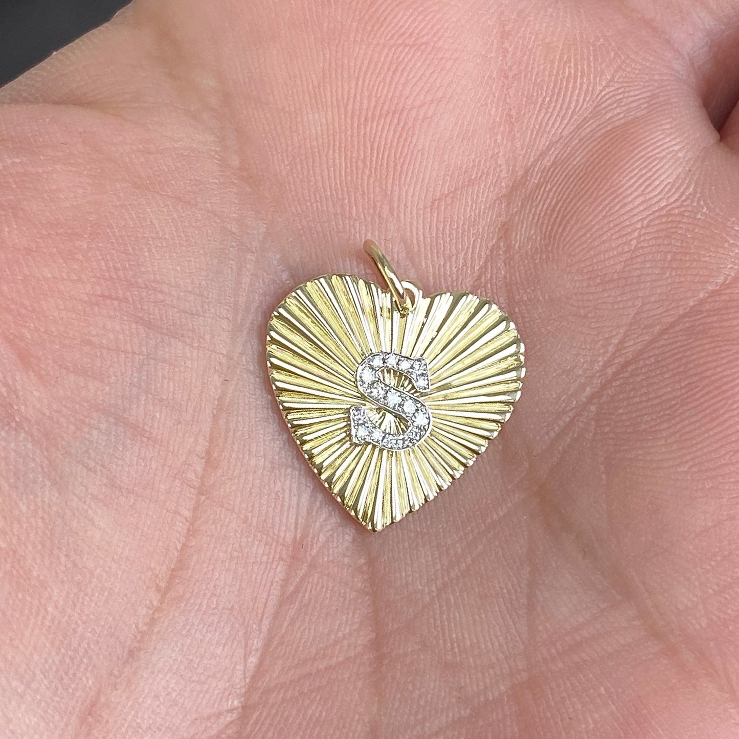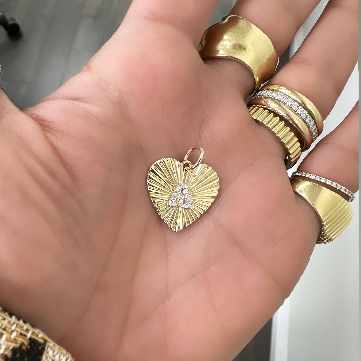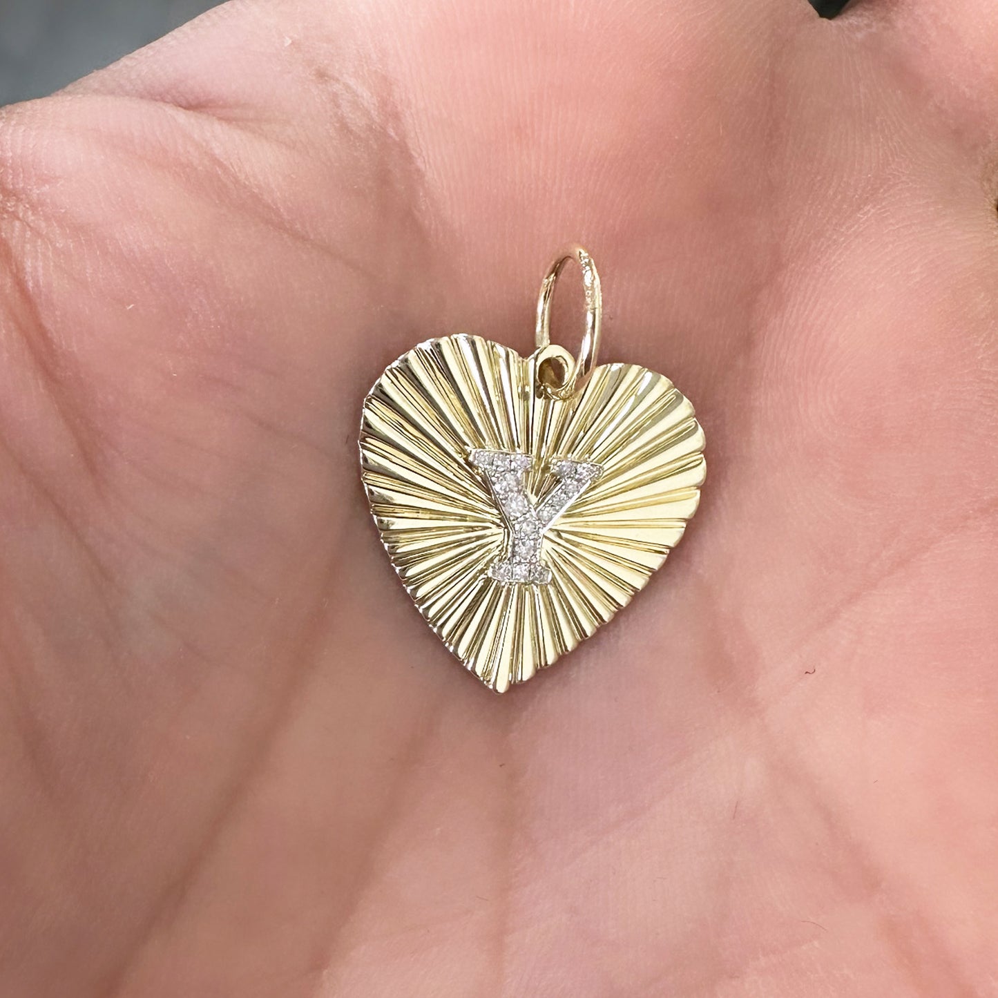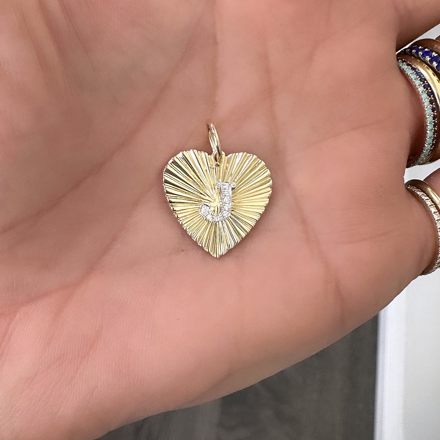 14K Gold Pavé Diamond Initial Fluted Heart Medallion Pendant, Medium Size Heart
