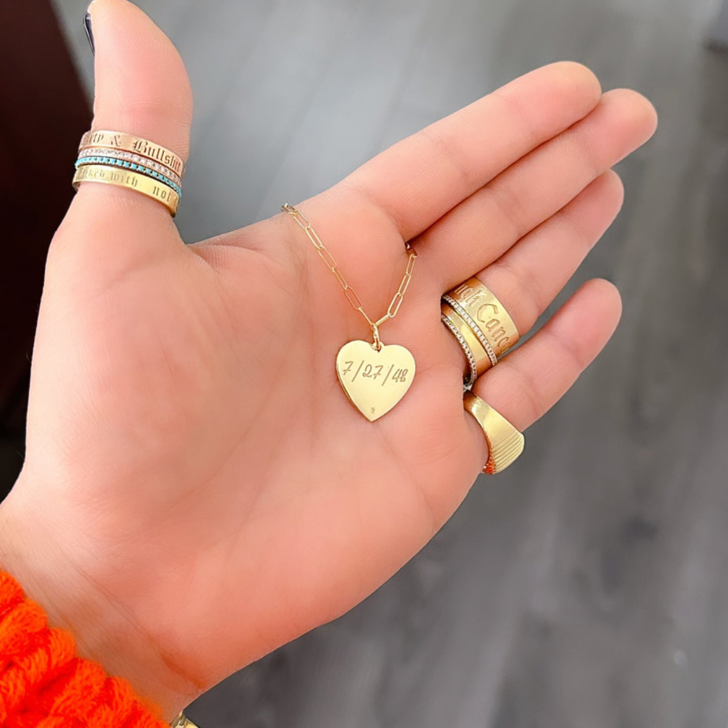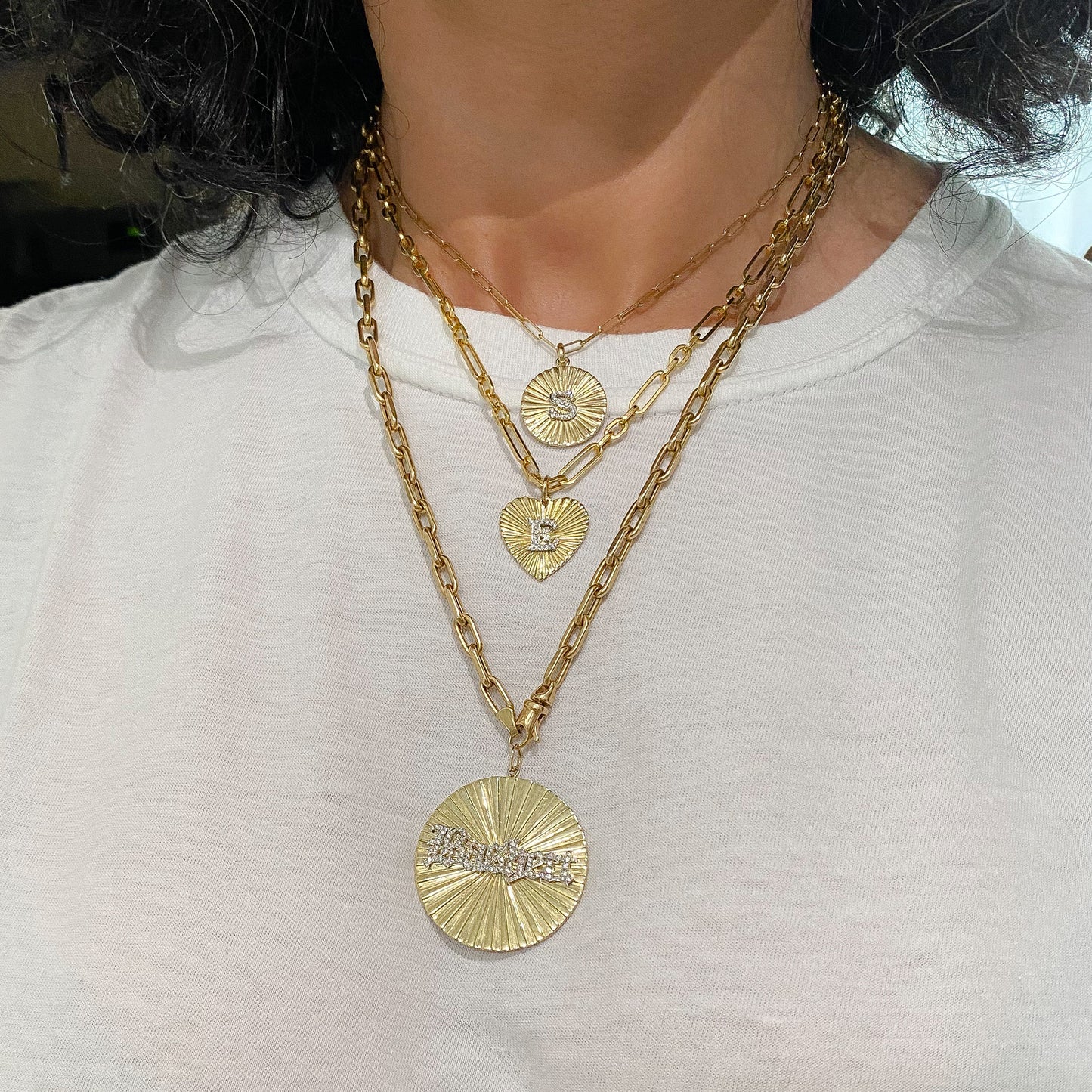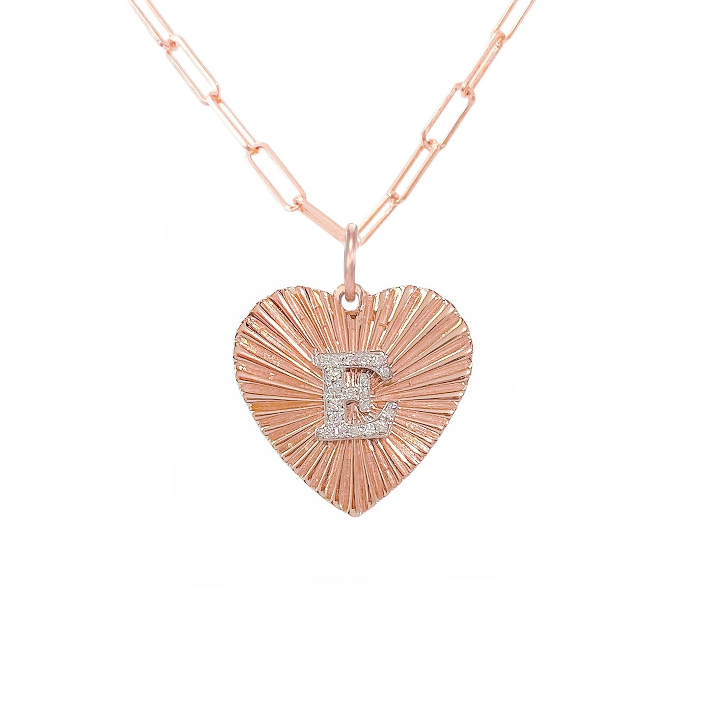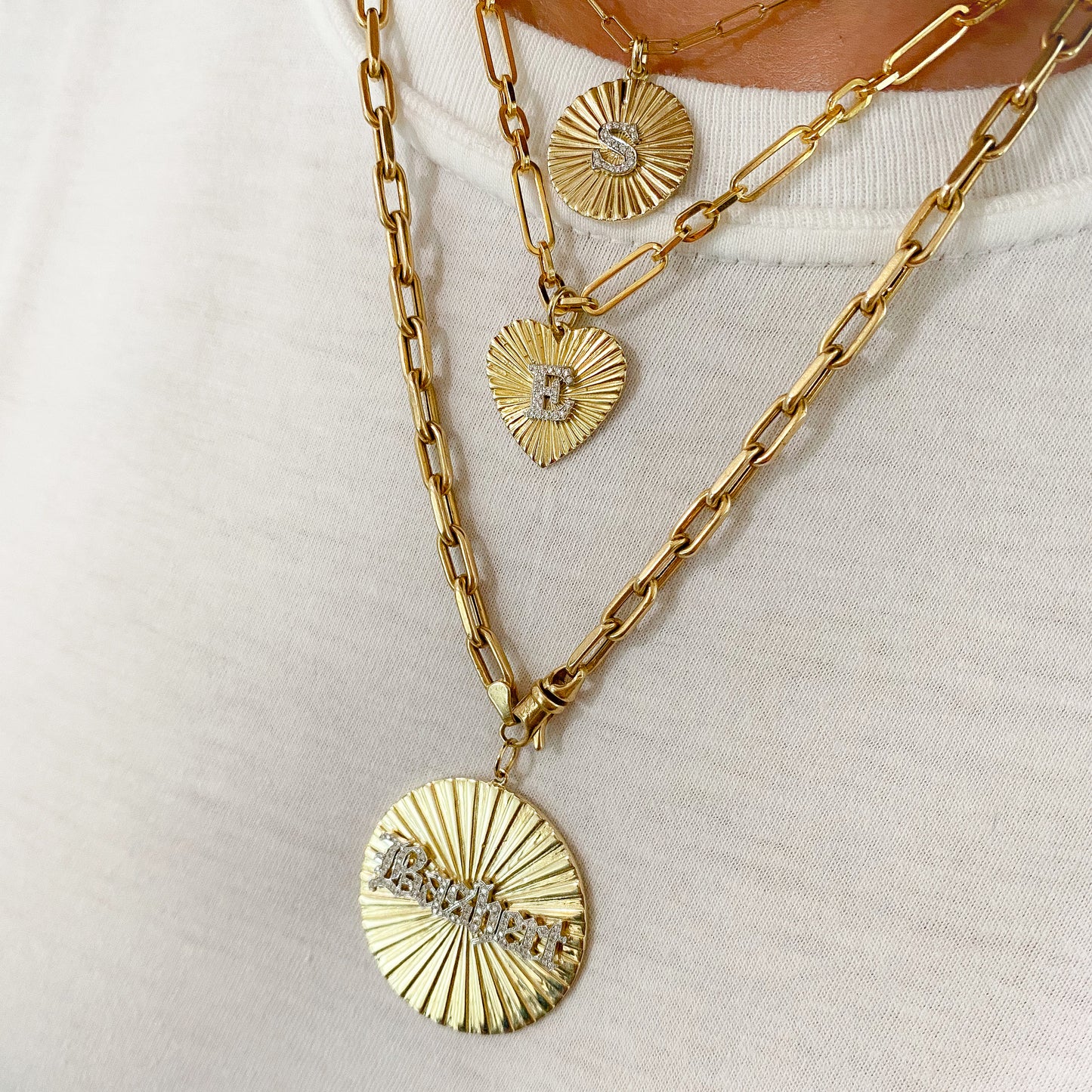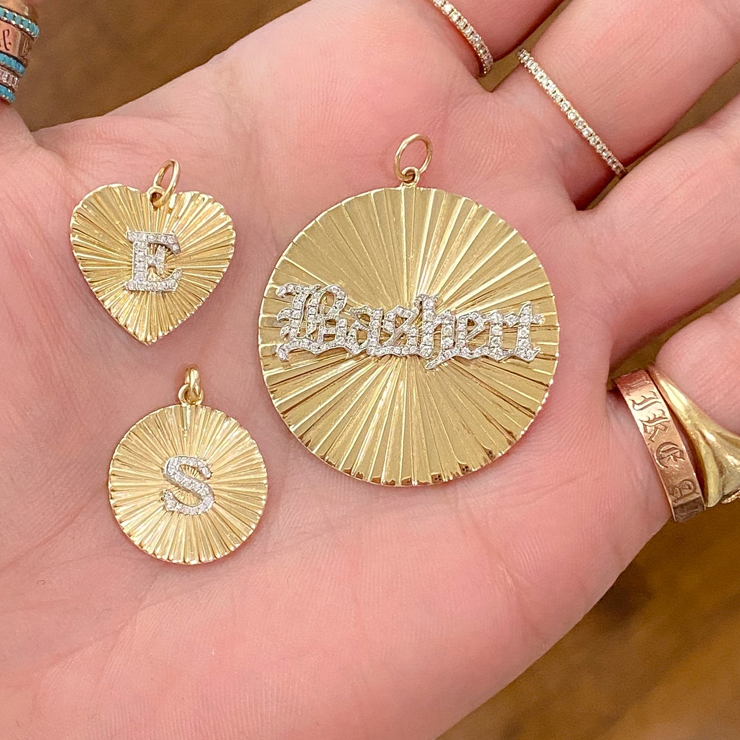 14K Gold Pavé Diamond Initial Fluted Heart Medallion Pendant, Medium Size Heart