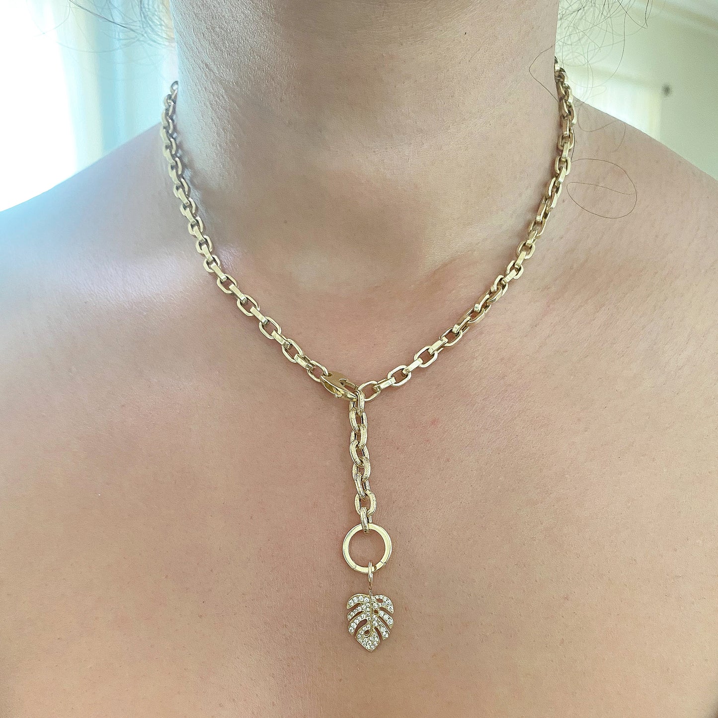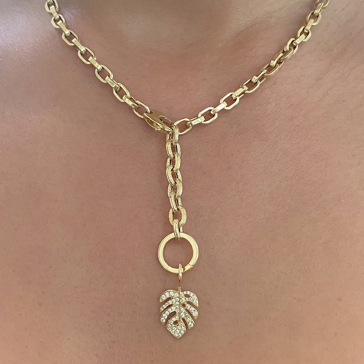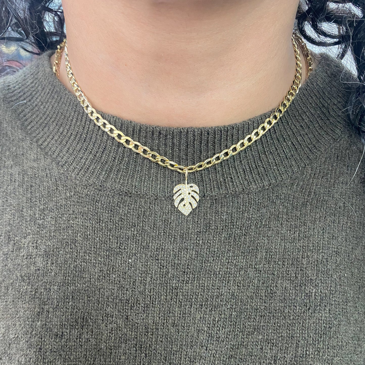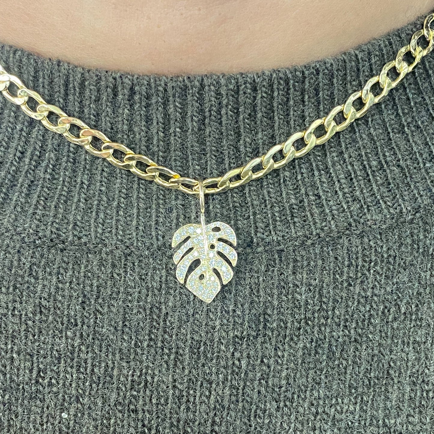 Crafted from 14K solid gold, this exquisite monstera palm leaf pendant showcases the refined artistry of hand-pavé diamond setting. Each stone is a genuine natural diamond of GVS1 quality, meticulously positioned to enhance the botanical silhouette. Versatile in design, this charm pendant pairs seamlessly with any chain from our curated collection, allowing you to customize your piece to reflect your personal aesthetic.