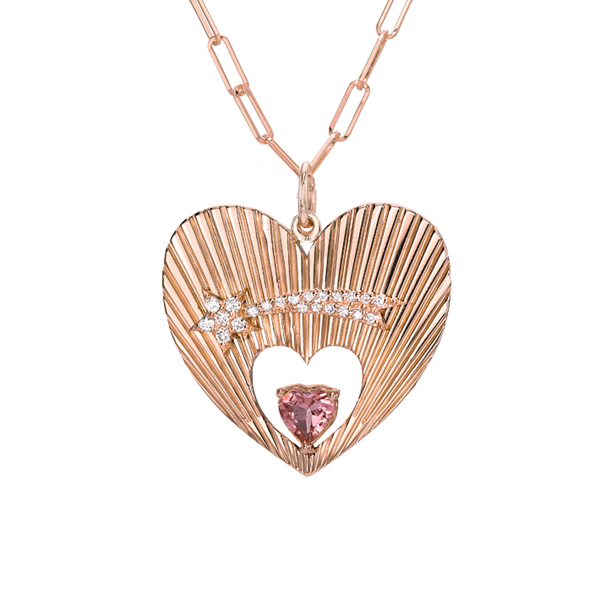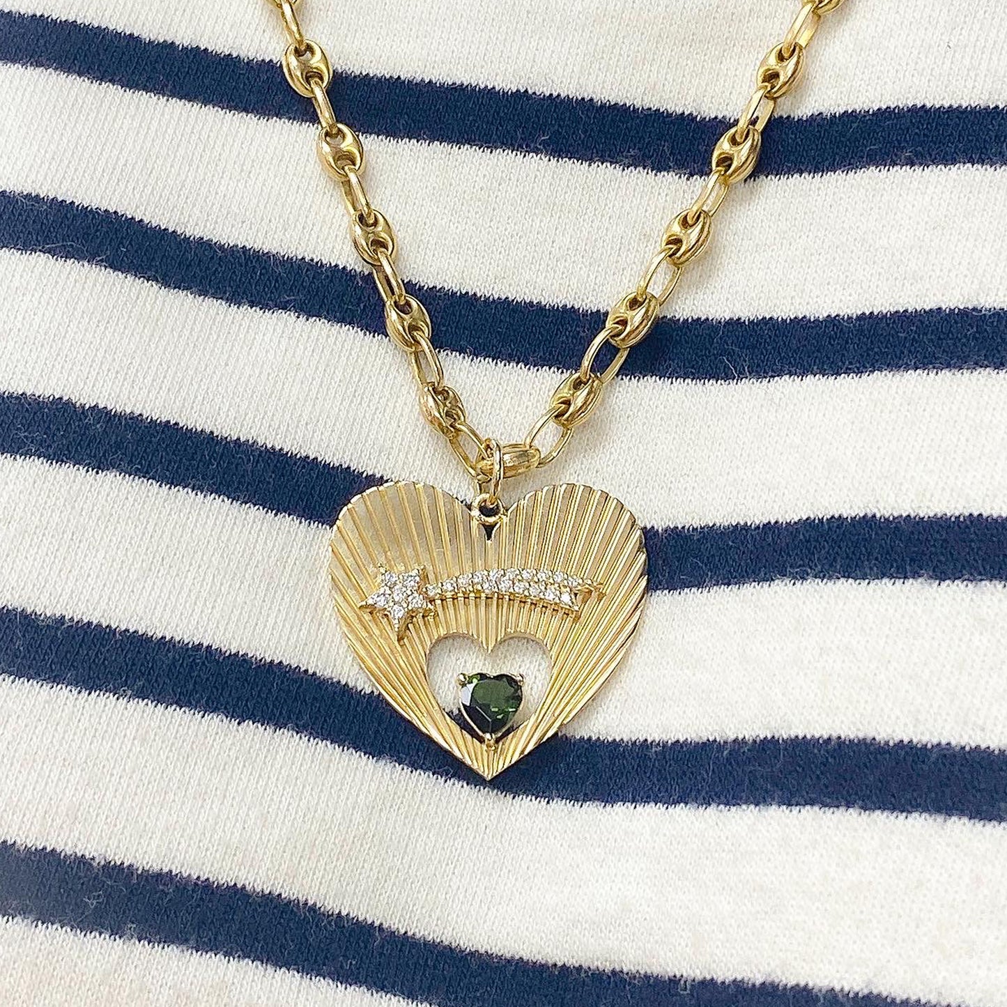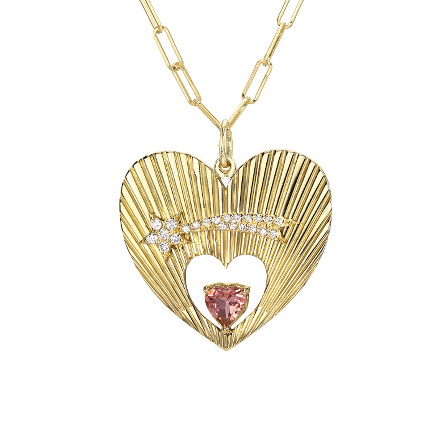 14K Gold Pavé Diamond Shooting Star Fluted Heart Medallion Necklace With Solitaire Tourmaline